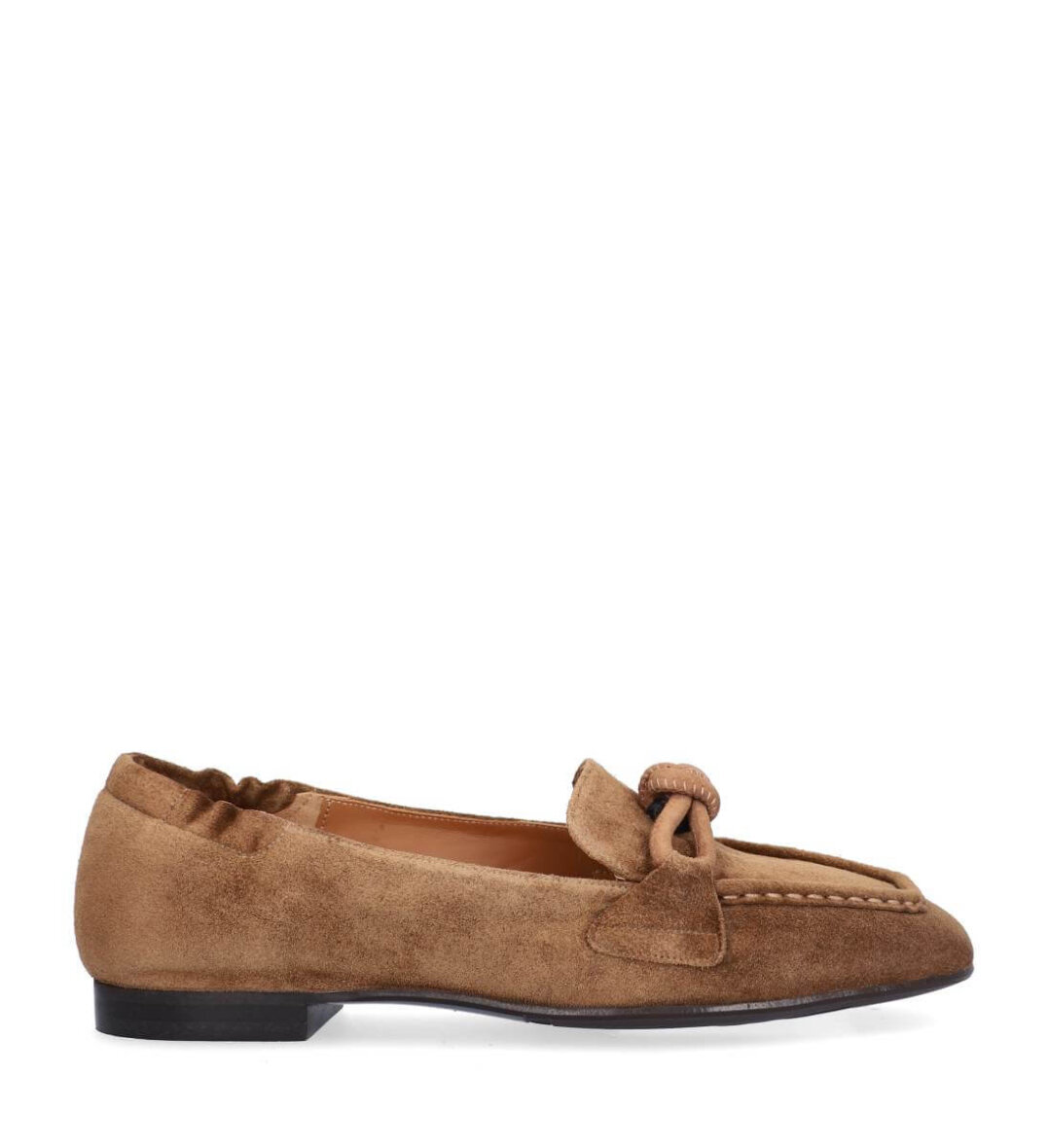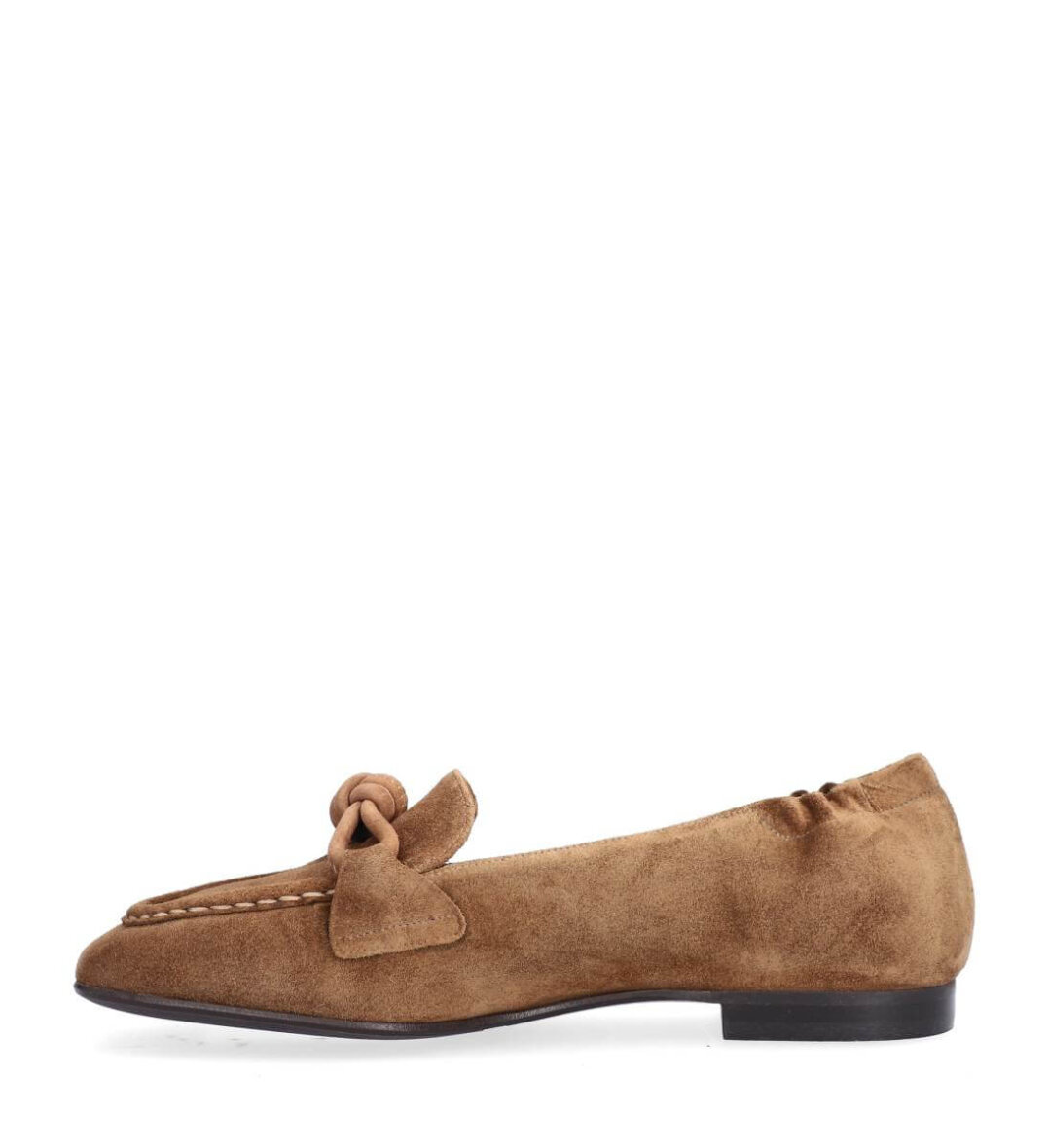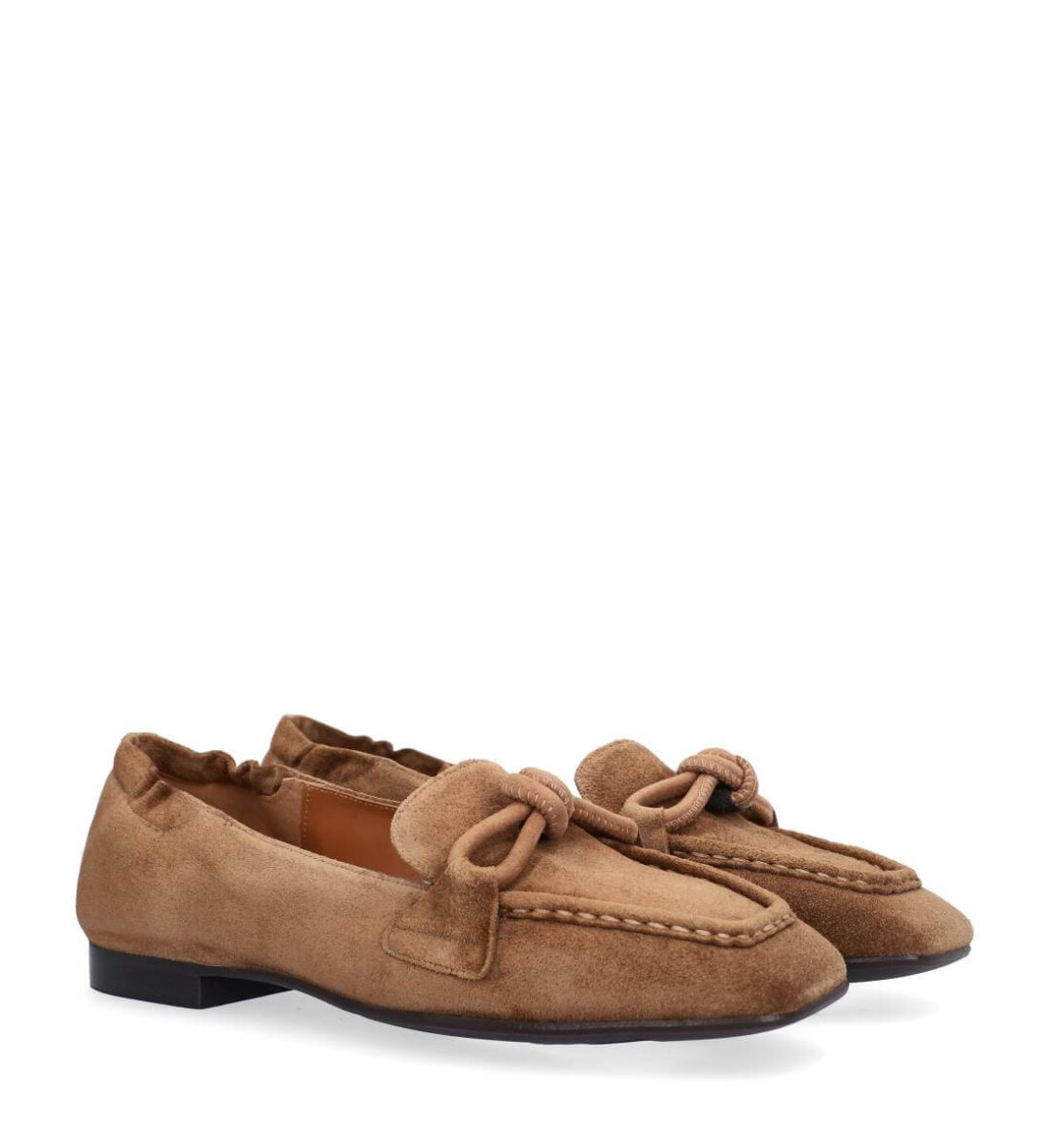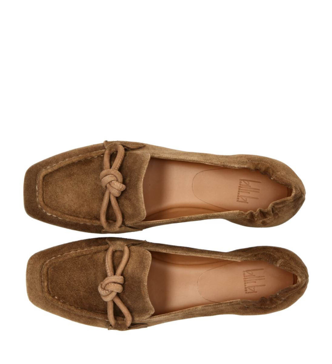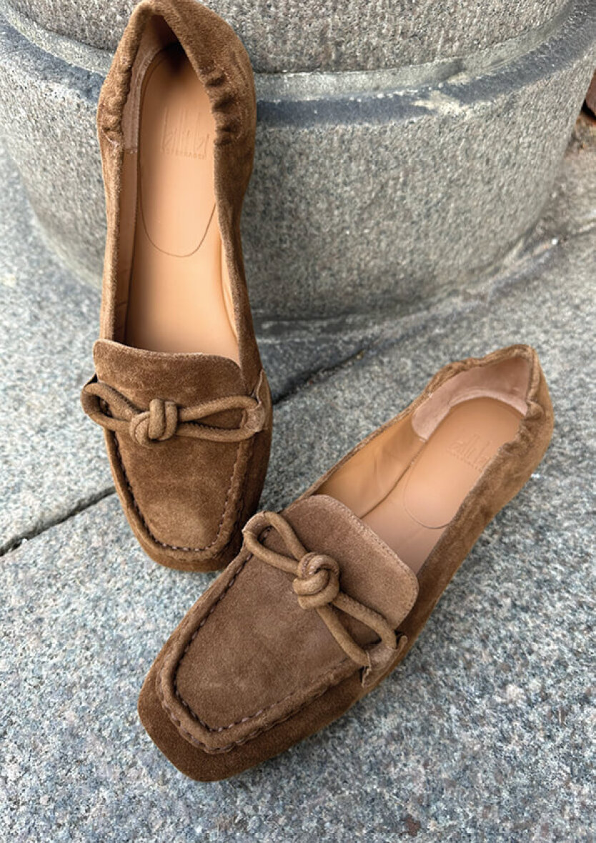 Håndlavet Billi bi loafers / ballerina i blødt brunt ruskind med let firkantet tå og dekorativ knudedetalje over forfoden.