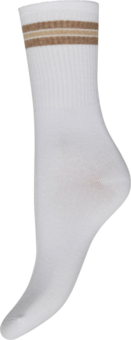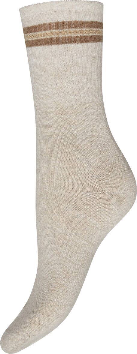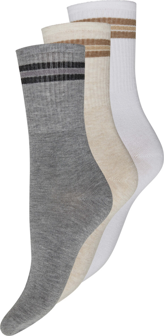 3-pakken består af tre forskellige strømper i farvene grå, hvid og sand. Strømpernes øverste del er i ribbet kvalitet med stribet design med en enkelt glimmer stribe og to ensfarvet. Et enkelt design med et elegant touch.