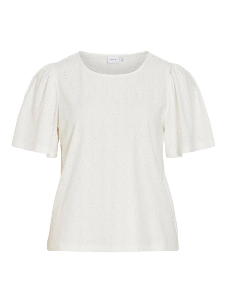 VILA top i modellen Vibello i en fin og alsidig hvid farve. Toppen er med et diskret mønster med syninger samt hulmønster.