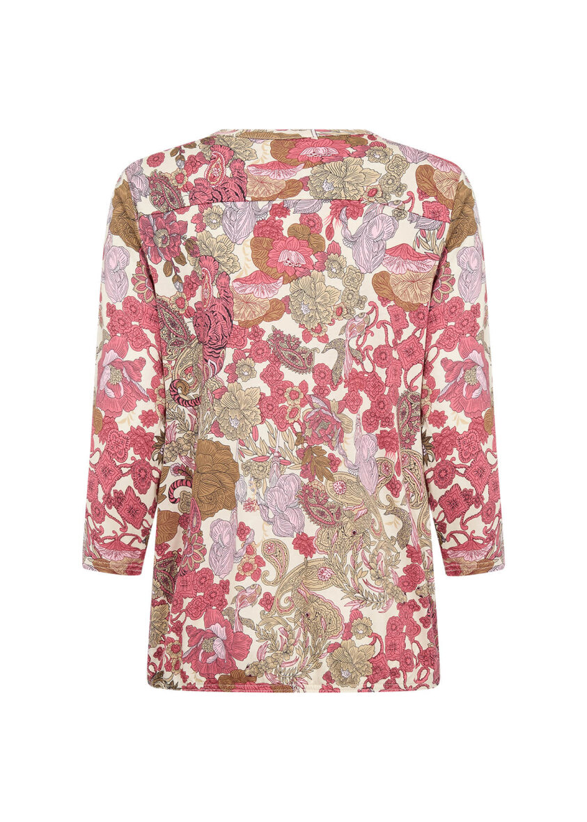 Soyaconcept bluse i den populære FELICITY model. Blusen er lavet i et farverigt blomstret paisley print med dyre detaljer i rød, rosa og beige nuancer.