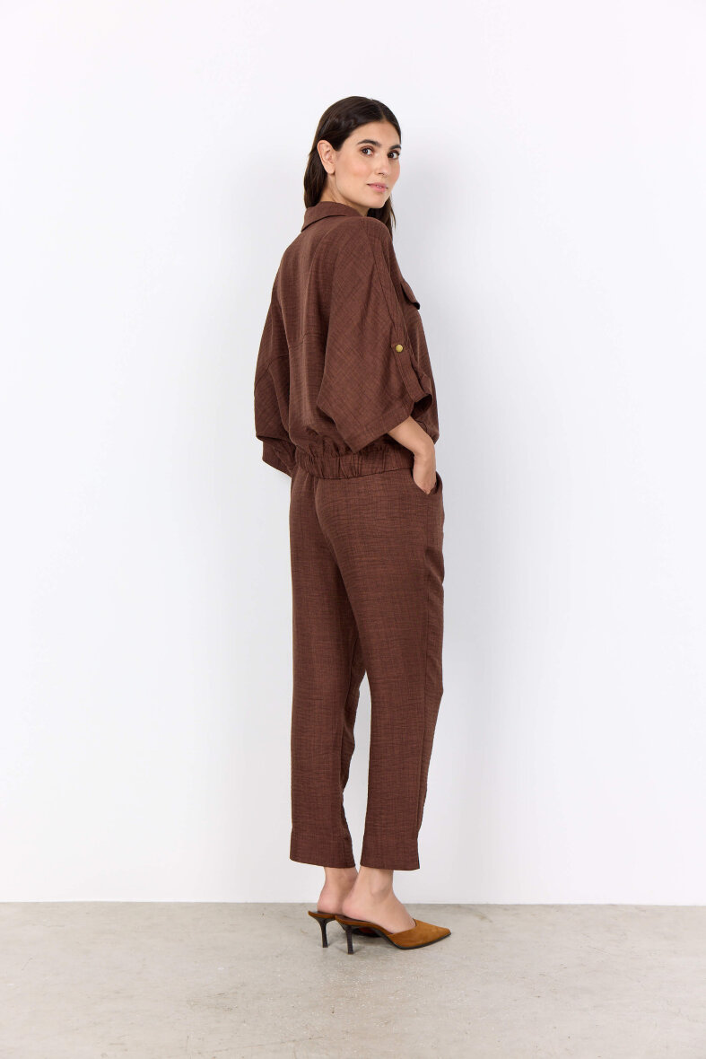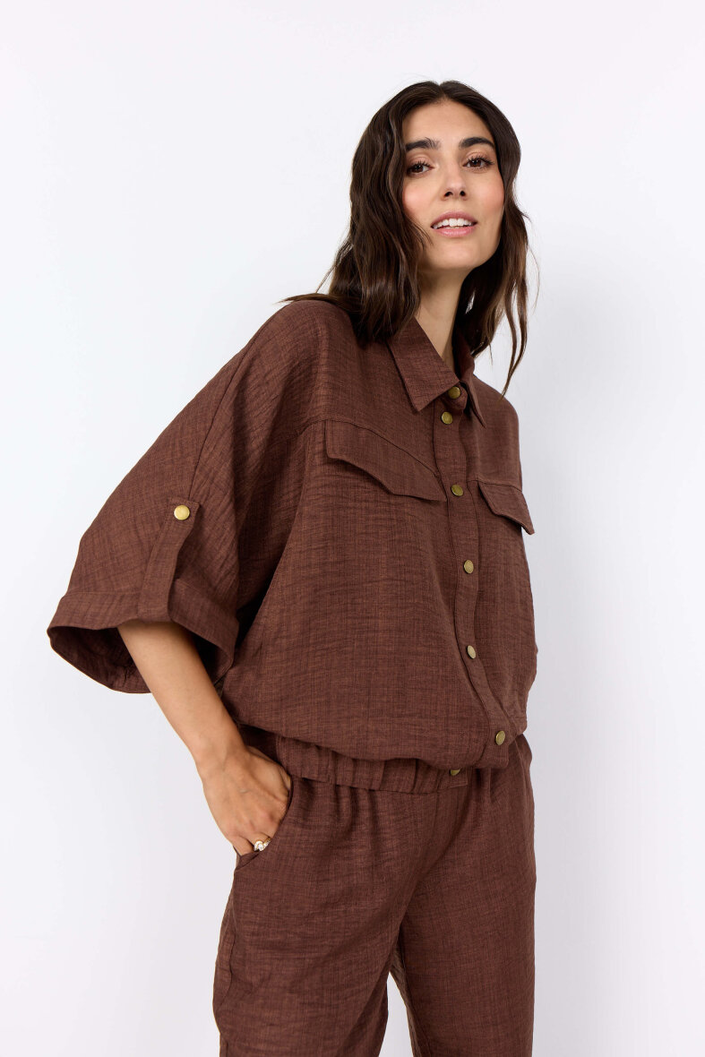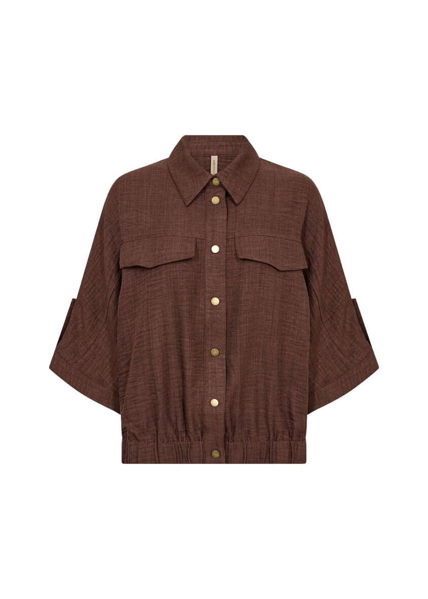 Soyaconcept skjortejakke i en flot brun meleret farve. Skjortejakken er med krave og lukkes med trykknapper foran. Skjortejakken er med korte brede ærmer med opsmøg effekt.