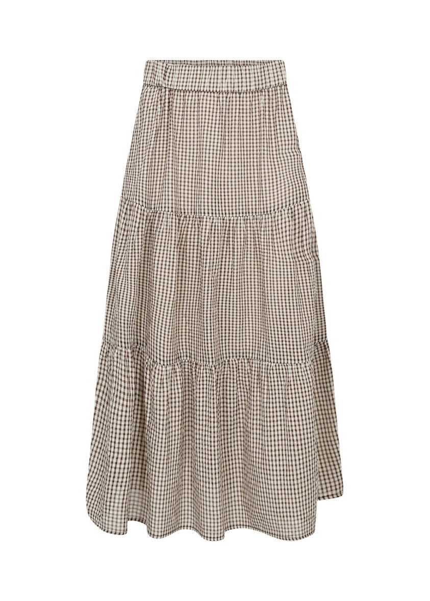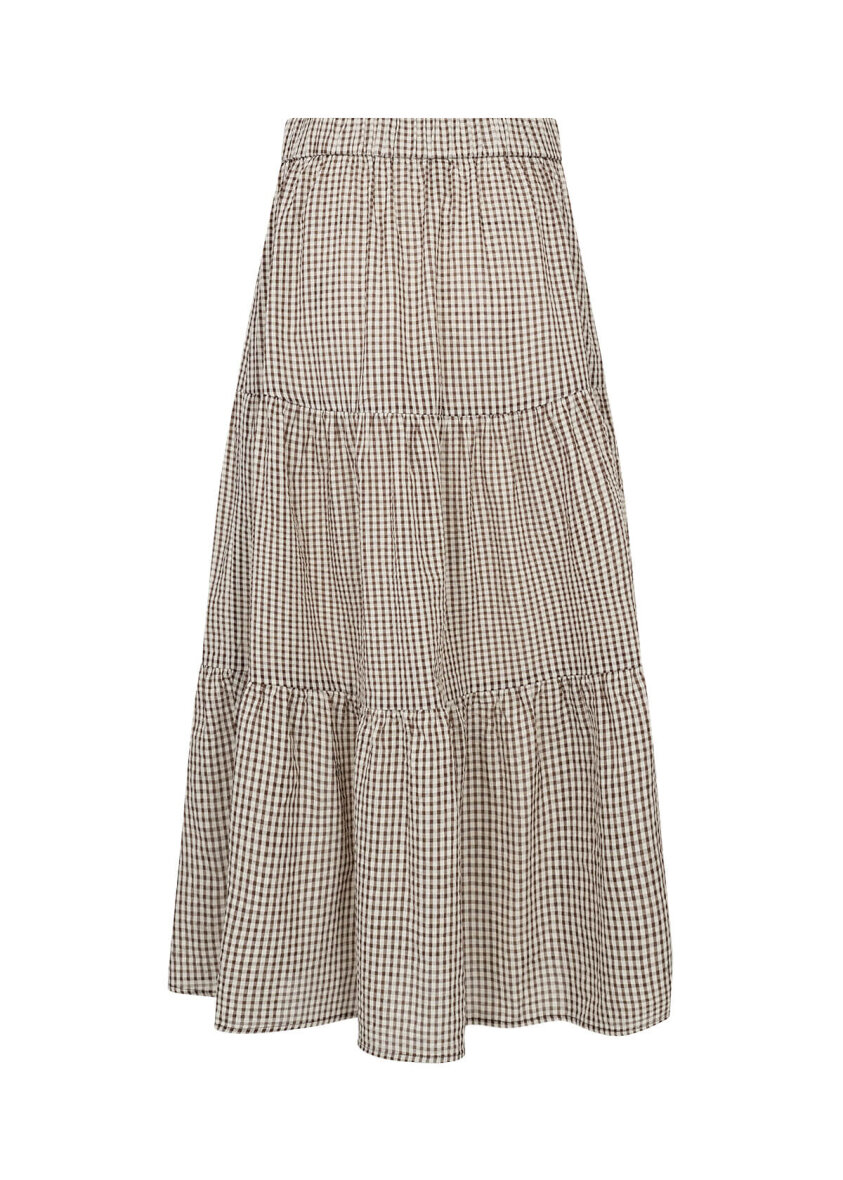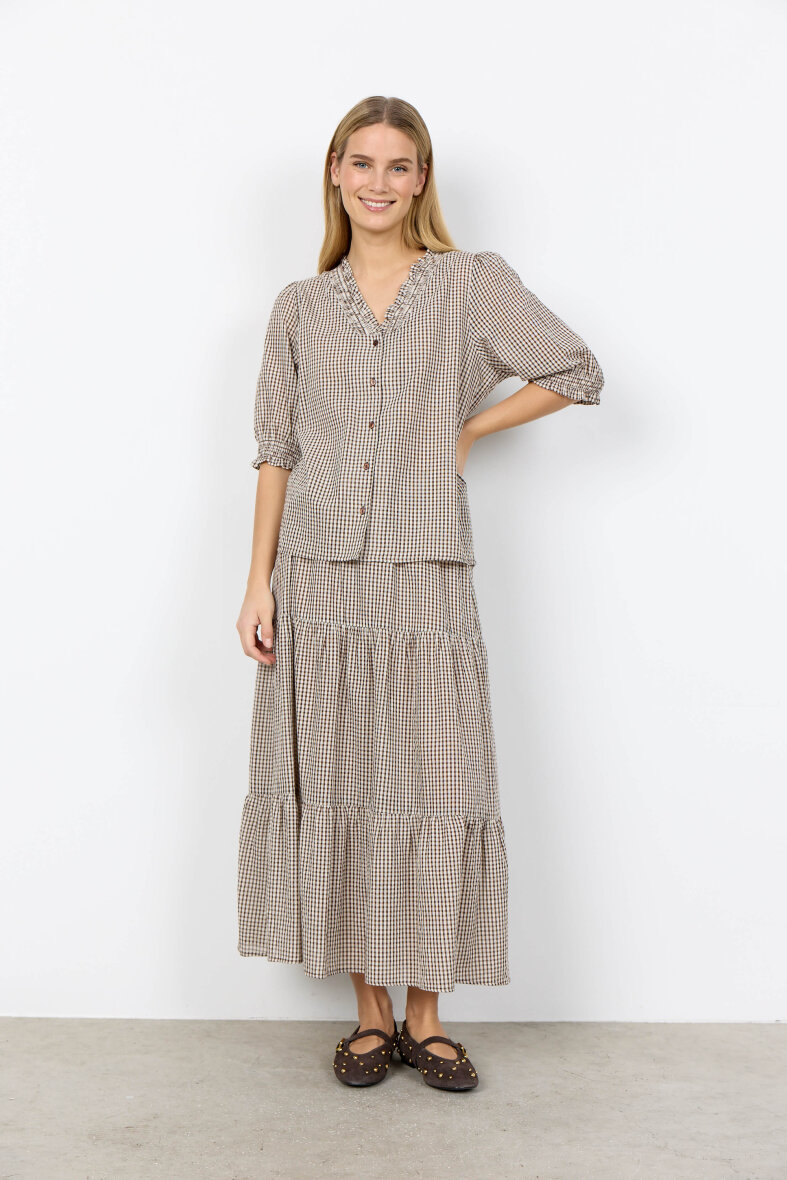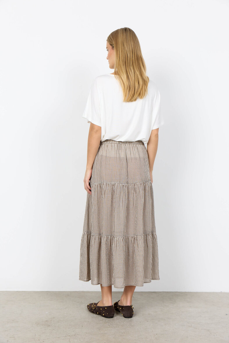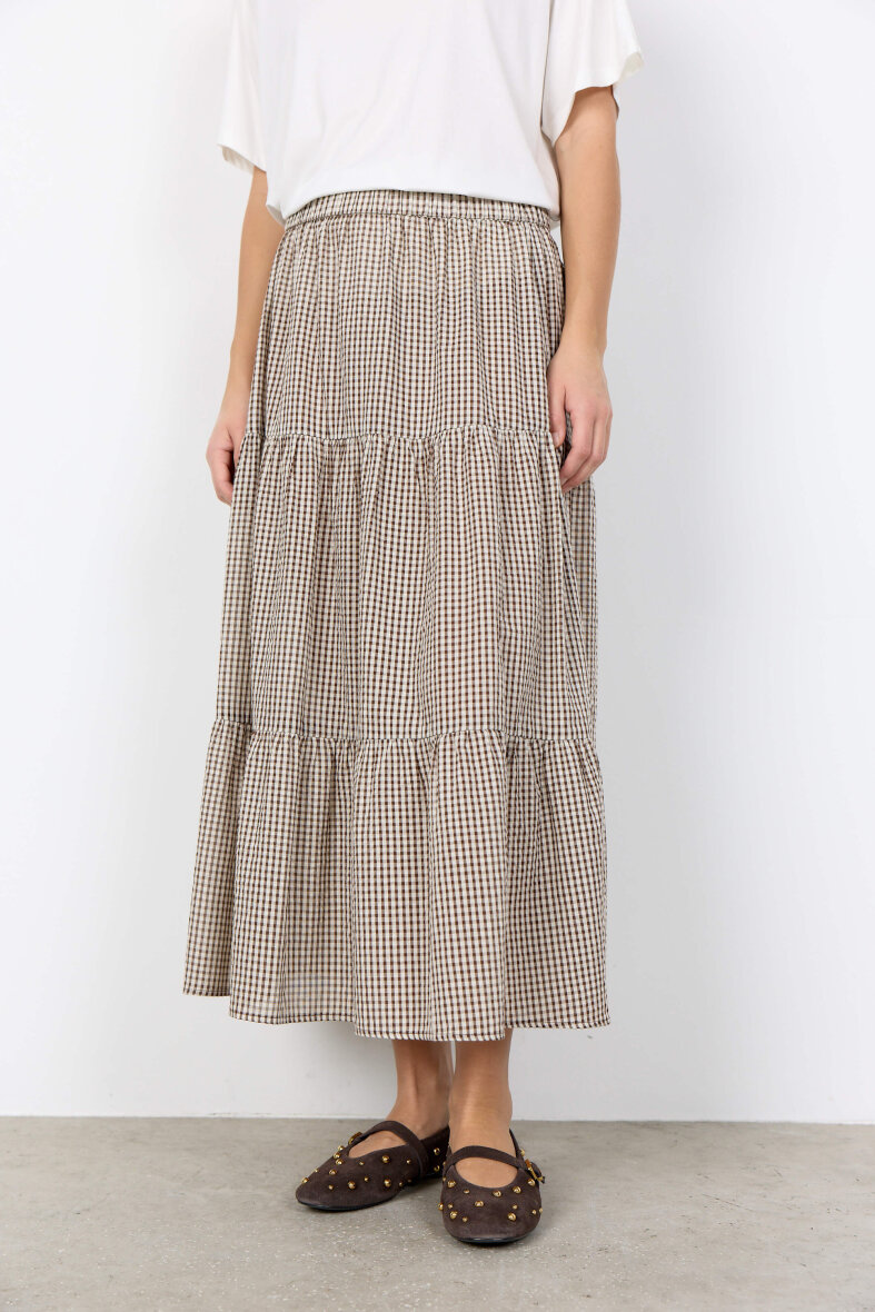 Soyaconcept nederdel i et moderne ternet mønster i brune toner. Canelita nederdelen er designet i et velkendt lagdelt design med en blød, flydende tekstur.