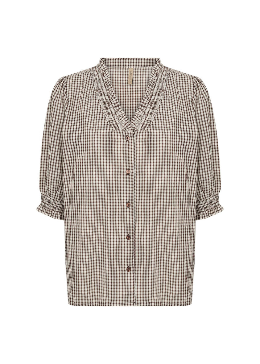 Soyaconcept skjorte i et moderne ternet mønster i brune toner. Skjorten i modellen Canelita er med en stilfuld flæsekrave og knaplukning langs fronten.