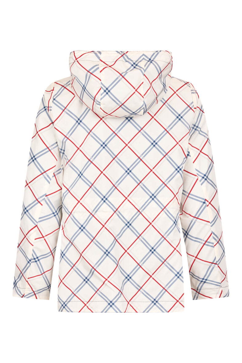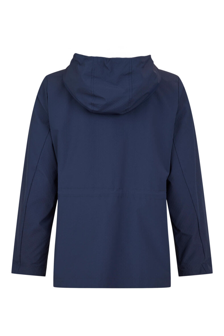 Jakken er med hætte og gennemgående langs fronten. Jakken er med hætte og stropper, så hætten kan spændes ind ved behov.