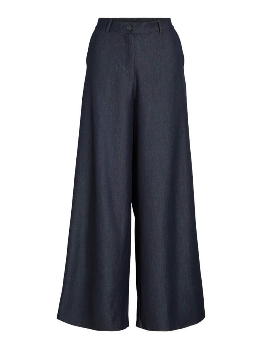 VILA bukser i modellen Viofala, er en højtaljet buks med wide fit i en flot navy melange farve - et sikkert valg til både hverdag og mere formelle anledninger.