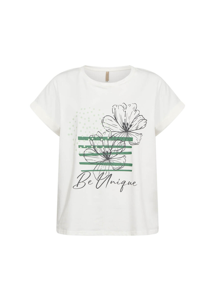 Soyaconcept t-shirt i en flot råhvid farve med tryk på fronten. Blomstret tryk med grønne prikker og striber og citat med orderne "Be Unique".