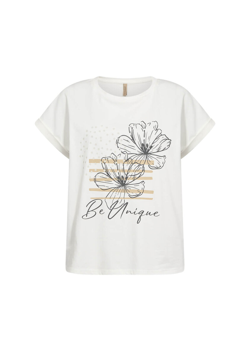 Soyaconcept t-shirt i en flot råhvid farve med tryk på fronten. Blomstret tryk med sandfarvet prikker og striber og citat med orderne "Be Unique".