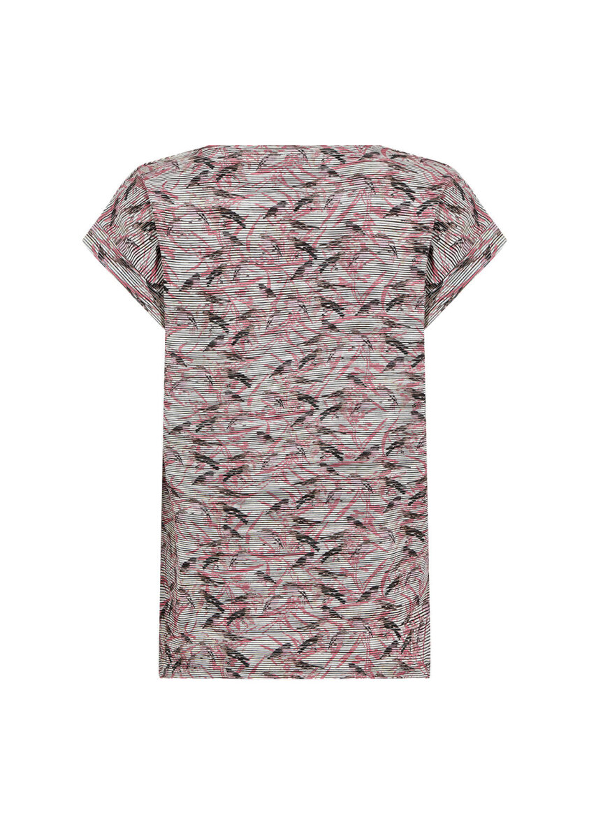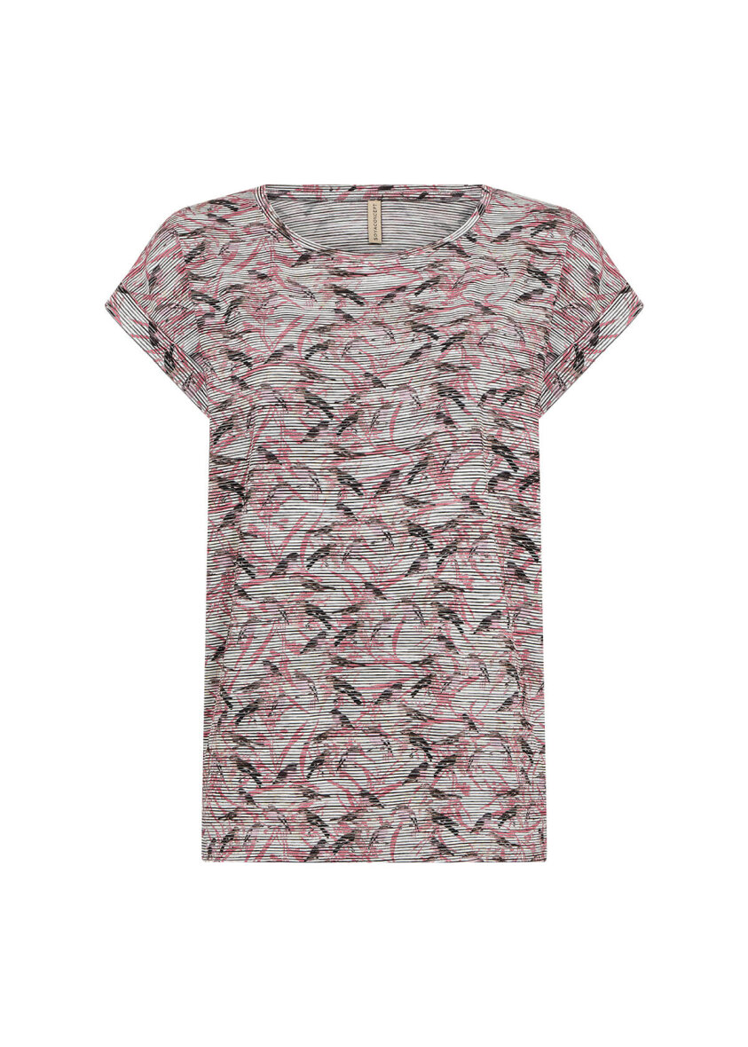 Flot t-shirt fra Soyaconcept i modellen Galina. T-shirten er lavet i et diskret stribet design med sorte striber og et flot fugle print i røde og brune nuancer.