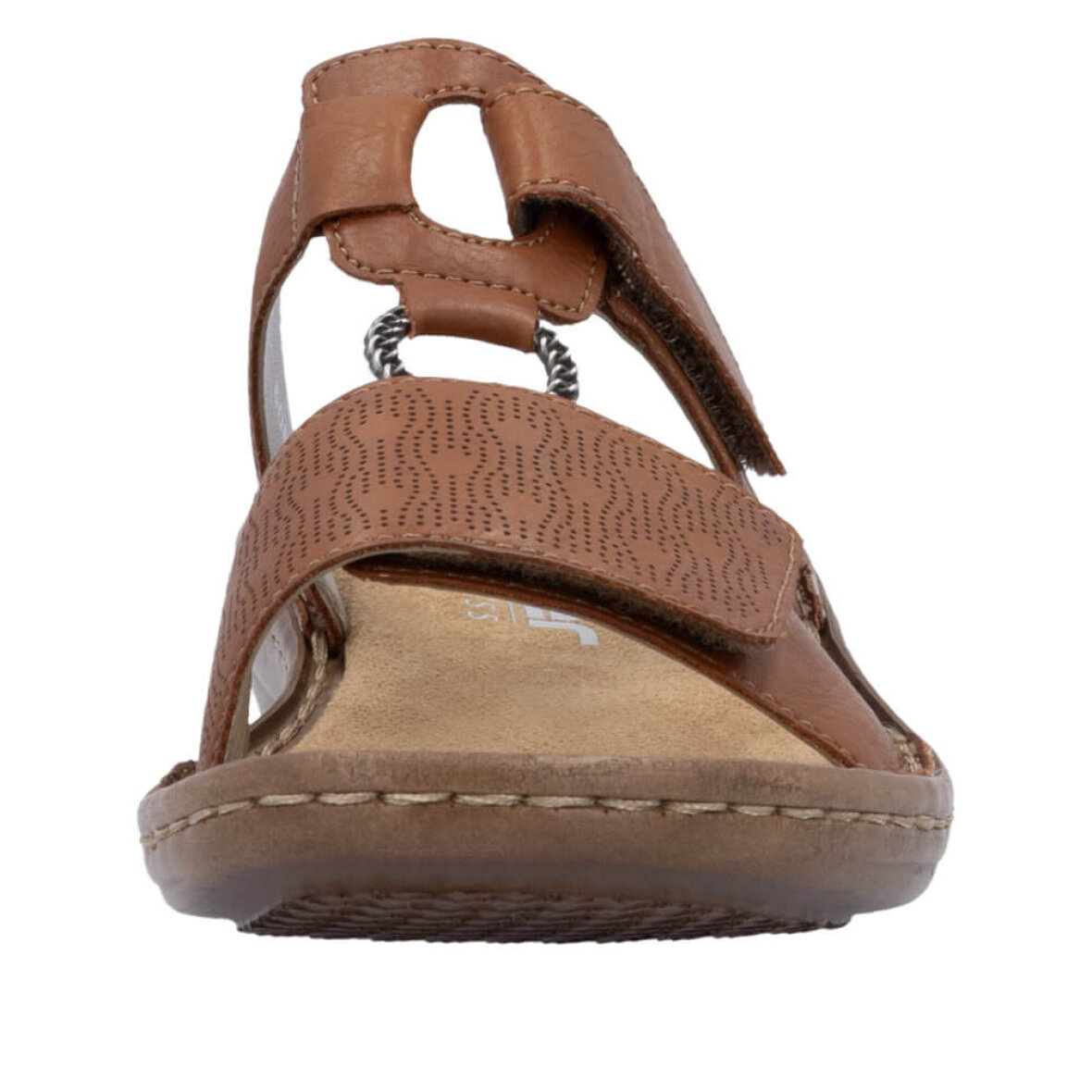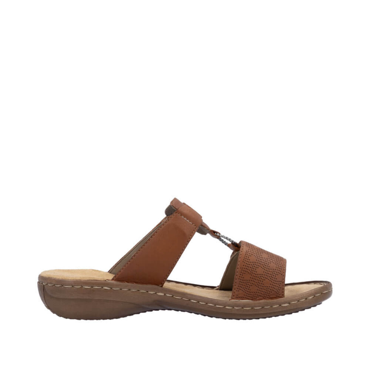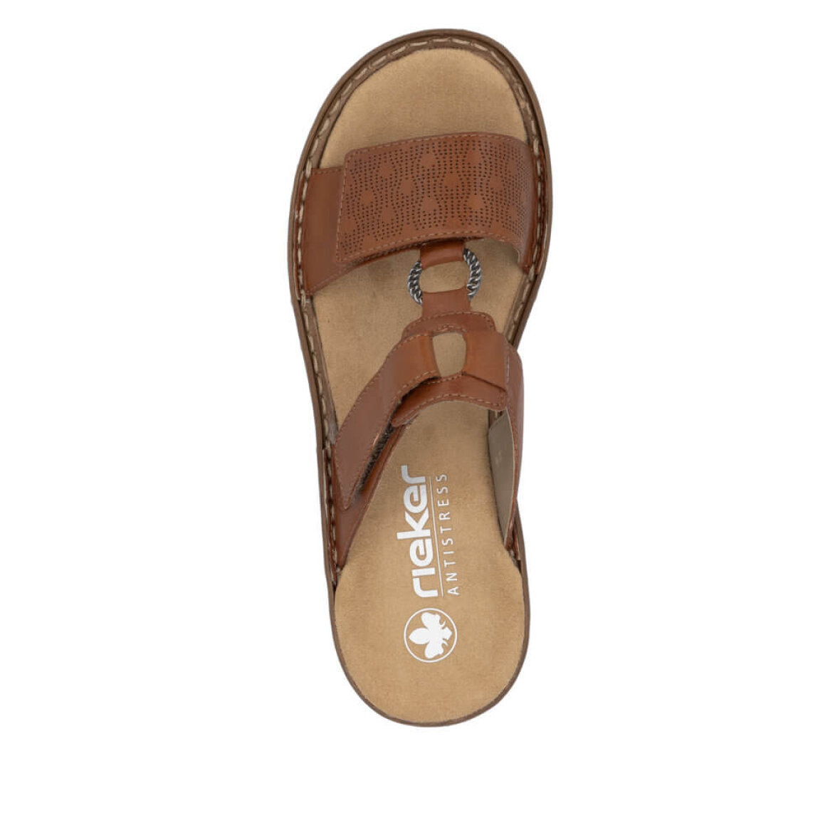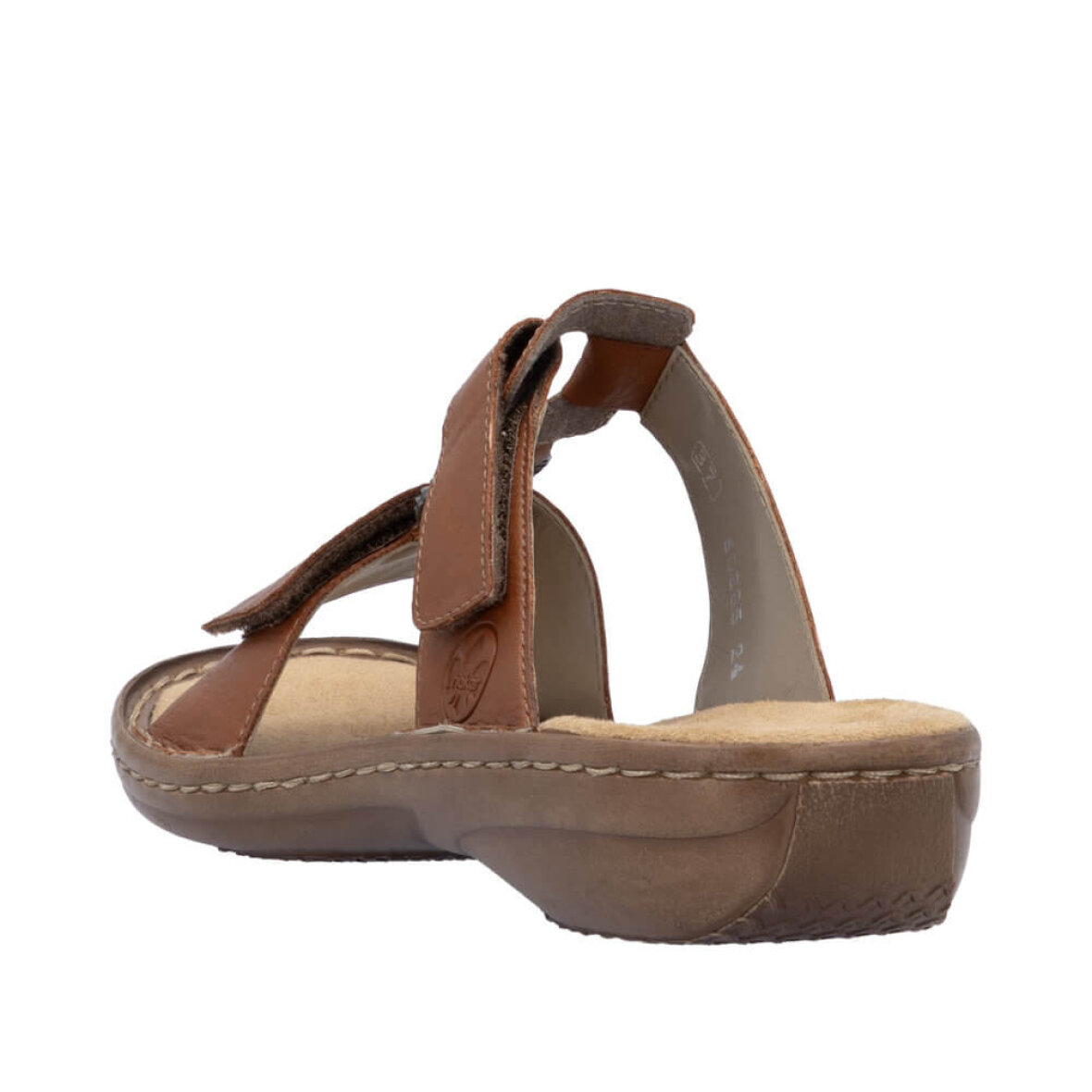 Rieker slipper sandal i et velkendt Rieker design, som vi elsker det. Sandalen er lavet i en flot brun farve i imiteret skind med to justerbare velcroremme.