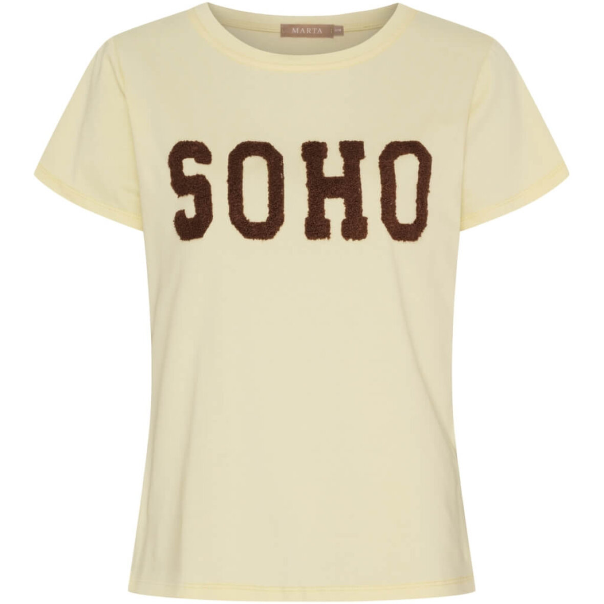 Marta Du Chateau t-shirt i en frisk gul farve med tryk på fronten i struktureret plys med ordet "SOHO" i en brun farve.