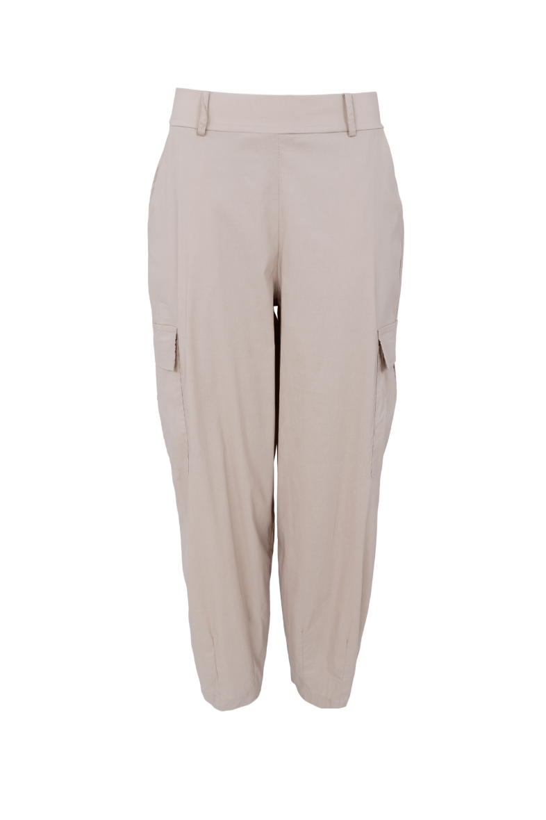 De lyse sandfarvet cargobukser er designet med klassiske cargolommer med flap på siderne, bæltestropper og en behagelig elastisk talje, som sikrer en flot og komfortabel pasform. Det lette og smidige materiale gør dem ideelle til hverdagen, hvor du ikke vil gå på kompromis med hverken stil eller komfort.