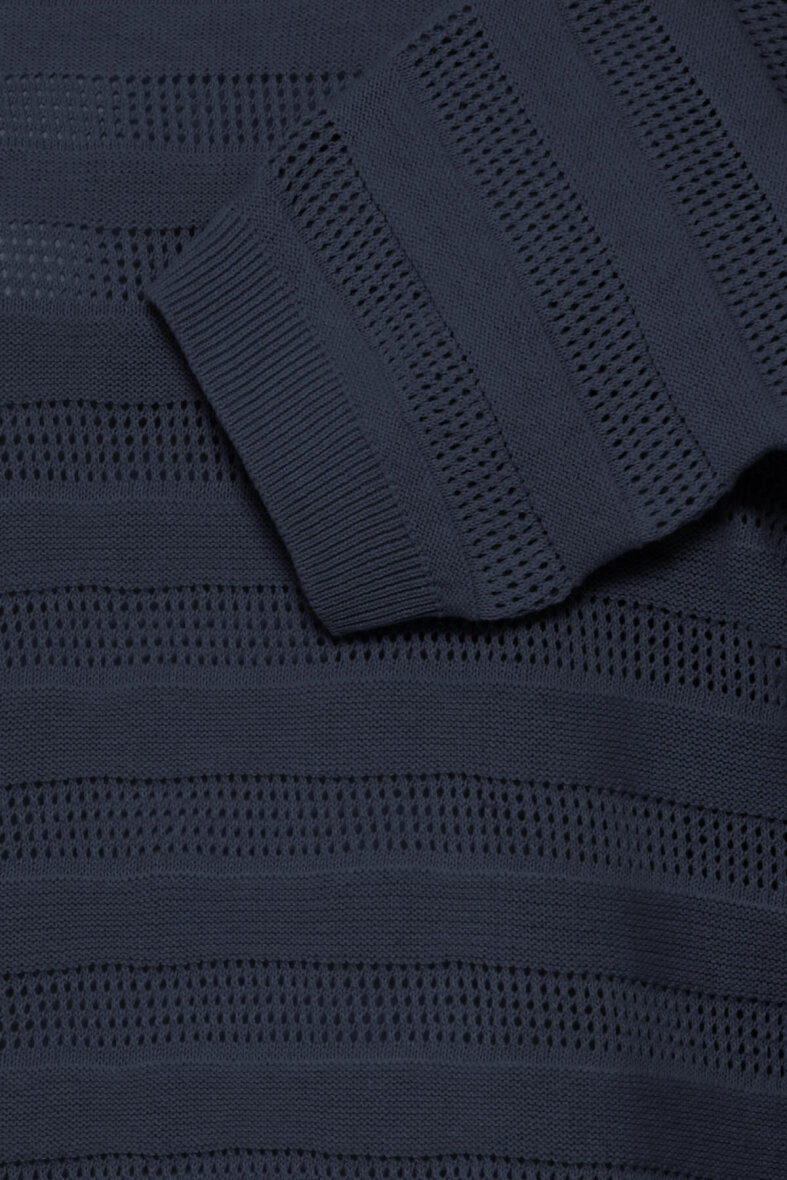 Strikken er med et tidsløst stribet mønster med hullet mønster og tæt vævning med struktur på de øvrige striber - hvilket giver et flot spil i strikkens design.