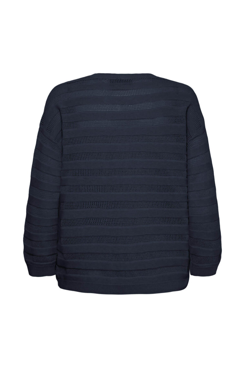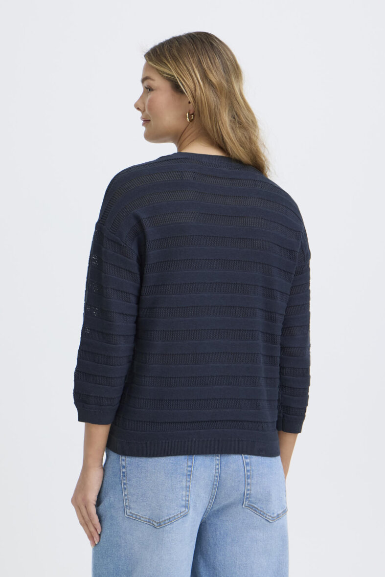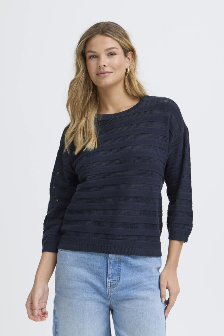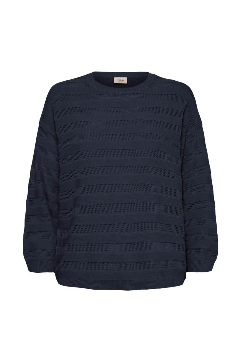 FRANSA strik i en enkel og tidløs klassiker med et moderne udtryk. Den mørkeblå farve er nem at style over både skjorter, kjoler, bluser og står også flot og enkel til et par klassiske jeans.