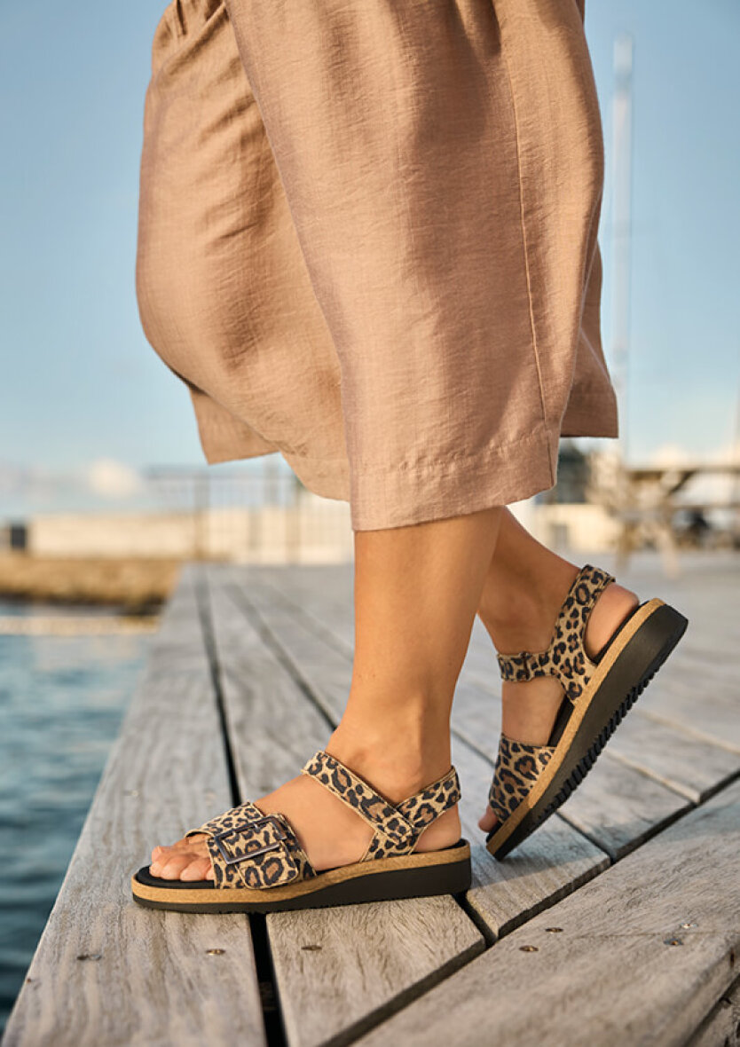 Komfortabel New Feet sandal i et moderne leopard print i en eksklusiv ruskindskvalitet.