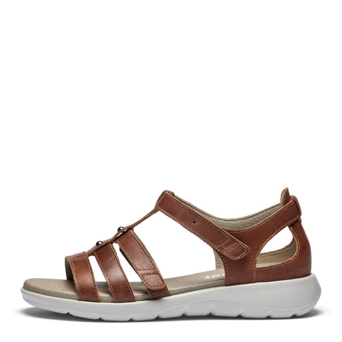 New Feet sandal i en skøn mørkebrun farve udført i glat læderkvalitet. Sandalen er lavet i et flot design med smalle remme, hvoraf den ene kan justeres med velcrorem samt ankelrem med velcroluk, så sandalen er nem at tilpasse pasformen, så sandalen sidder perfekt på foden hele dagen. Sandalen er med hælkappe, hvilket giver en god stabilitet og sikrer en komfortabel gangoplevelse. Perfekt til både hverdag, ferie og aktive dage på farten.