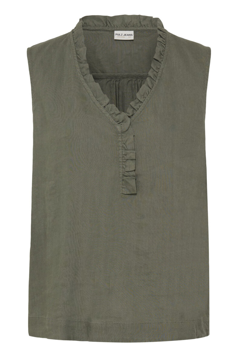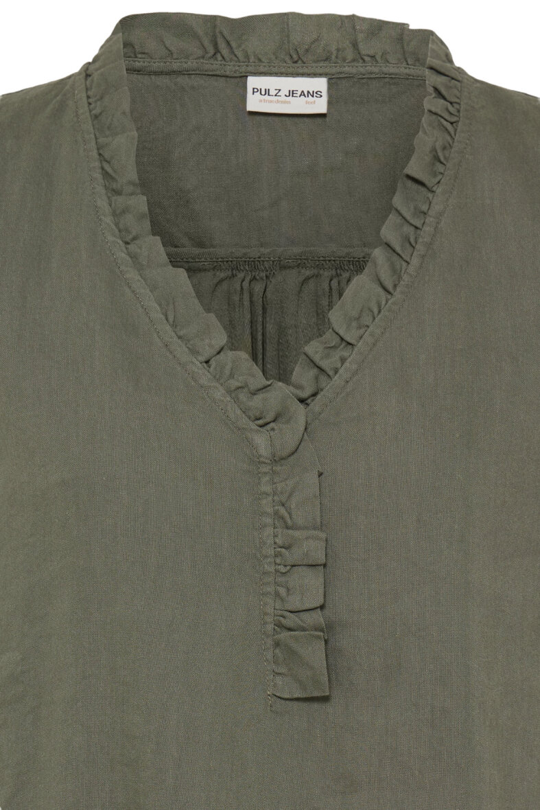 Pulz Jeans top i en moderne army grøn farve, som er nem at style til både sommer- og forårsoutfits, under en blazer eller denimjakke for et fint look.