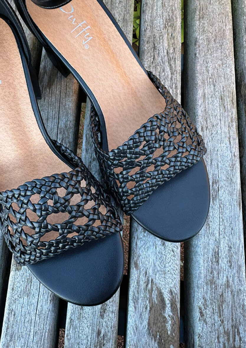 Duffy sandal i et flot og enkelt design. En sort sandal med hæl kan bruges til enhver anledning og er nemme at style til både hverdagens kontorlooks og festlige aften.