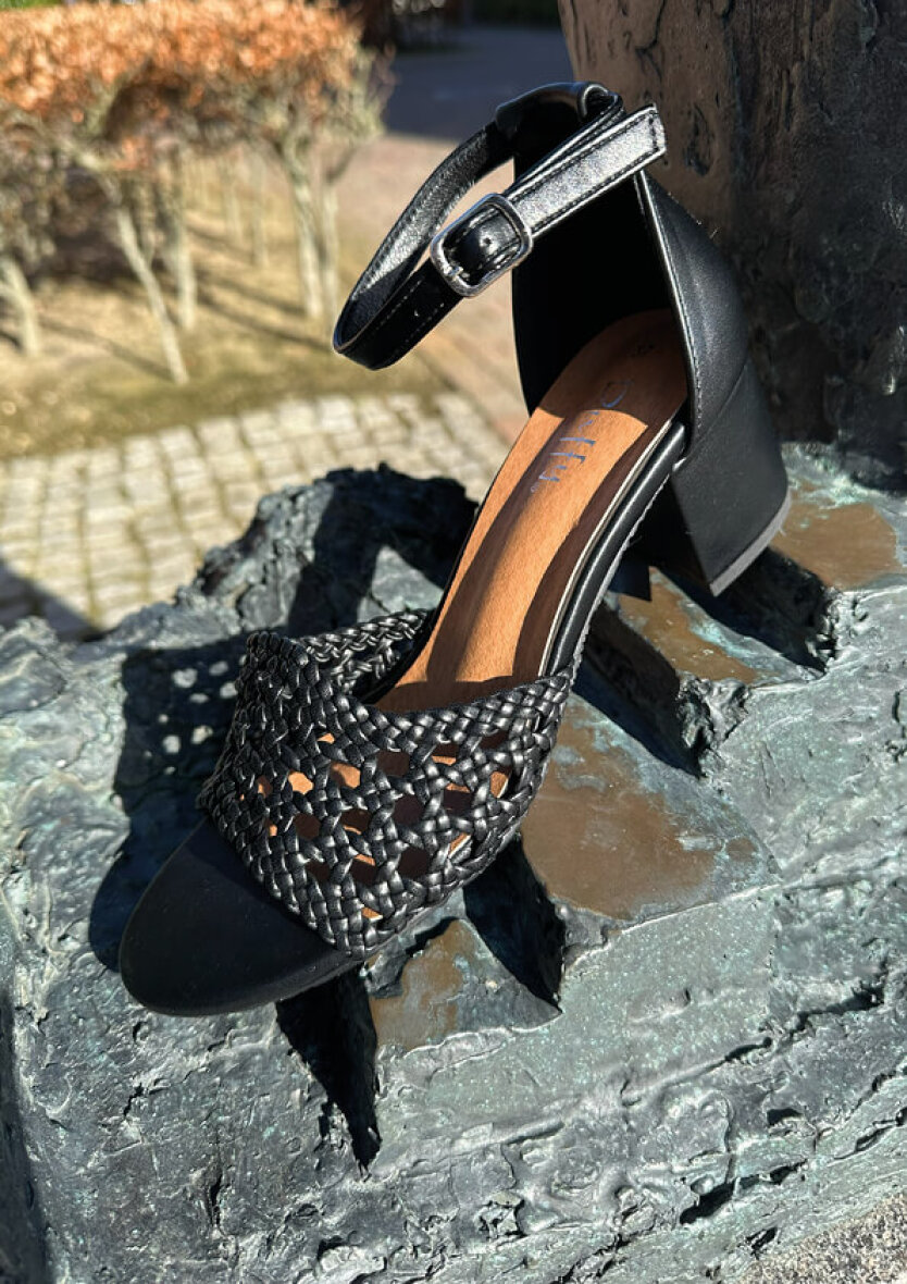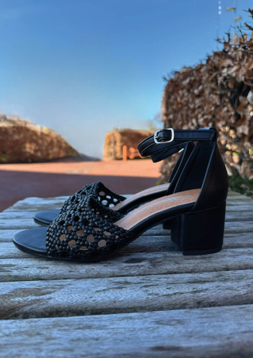 Sandalen har en elegant silhouette med en flot hælhøjde på 5 cm, der giver både længde og selvtillid. Sandalens brede rem ved forfoden er lavet i et smukt flettet, som er med til at give elegance til designet.