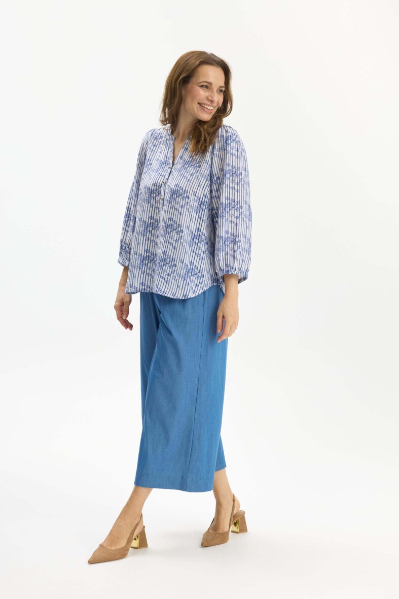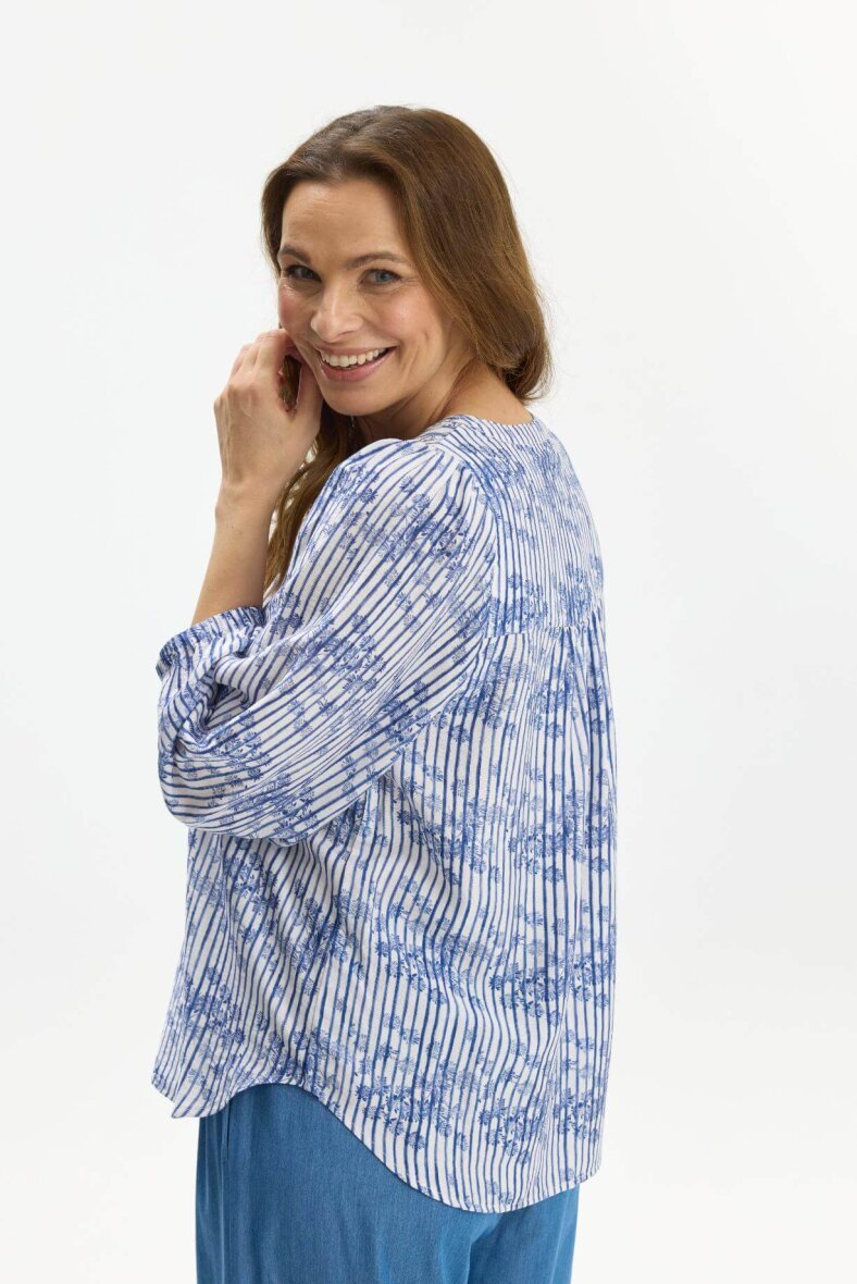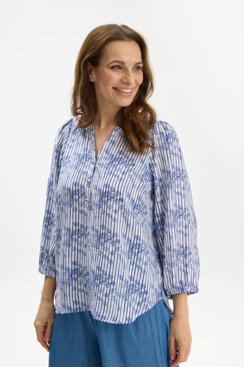 In Front bluse i modellen Victoria. Blusen er lavet i et flot og feminint blå/hvid stribet mønster med et diskret blomstret print i blå nuancer.
