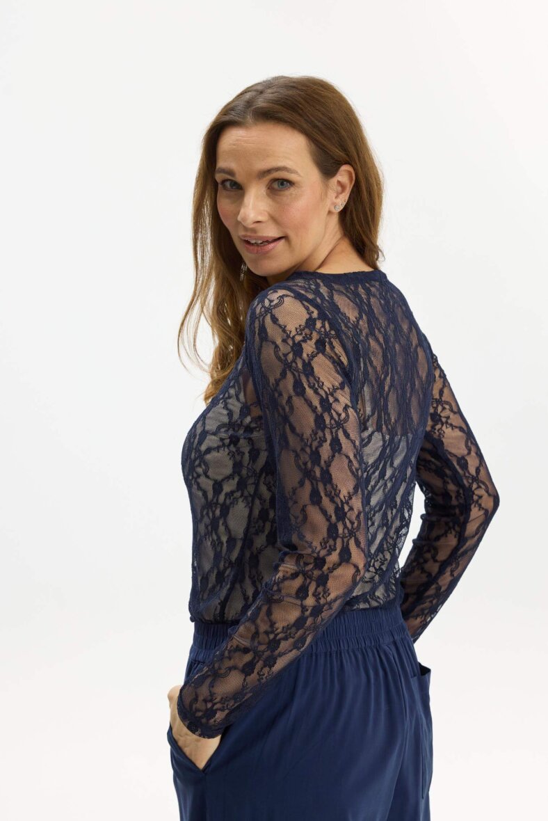 In Front mesh bluse med et fint og feminint blonde design med blomster. Den mørkeblå mesh bluse er med rund hals og lange ærmer.