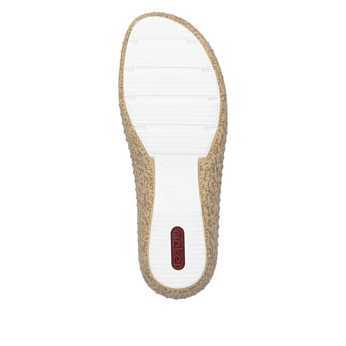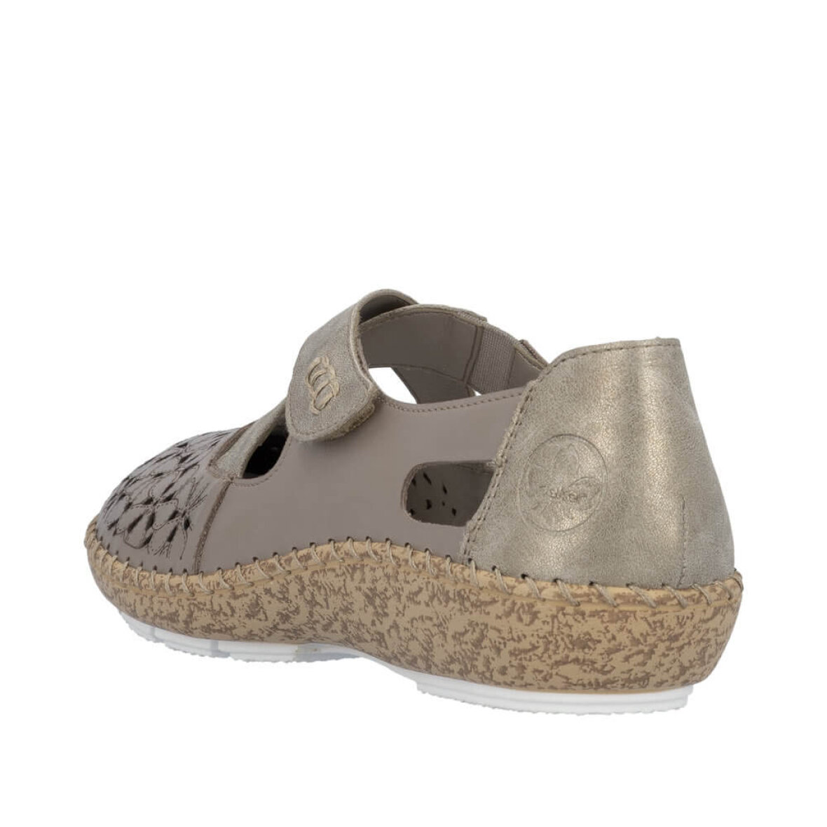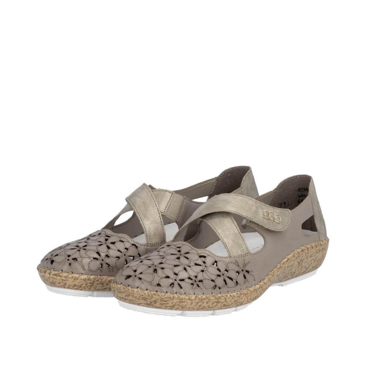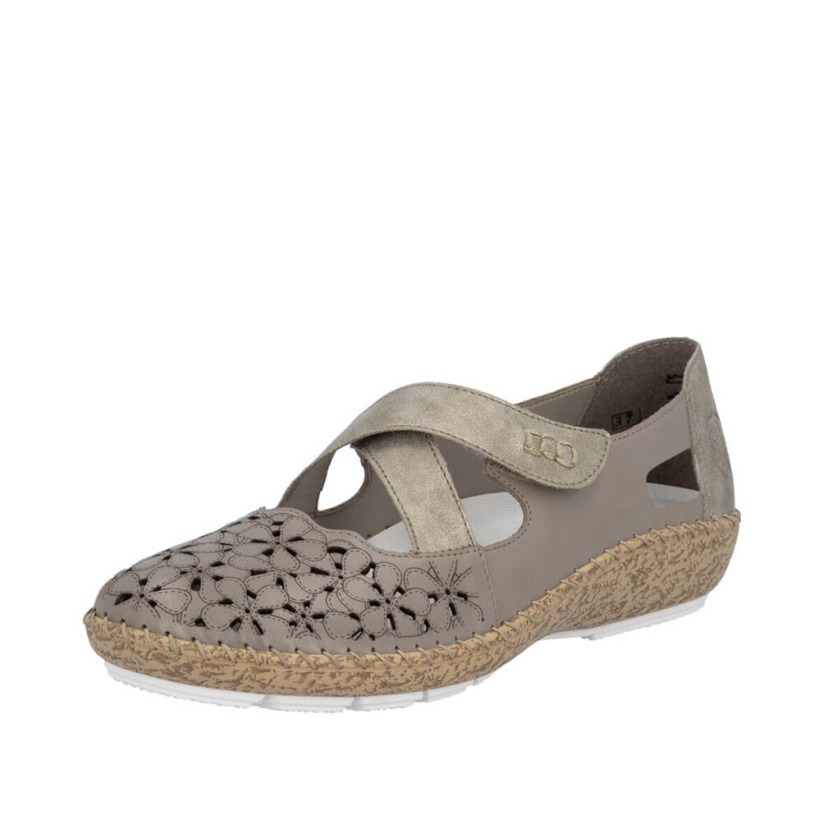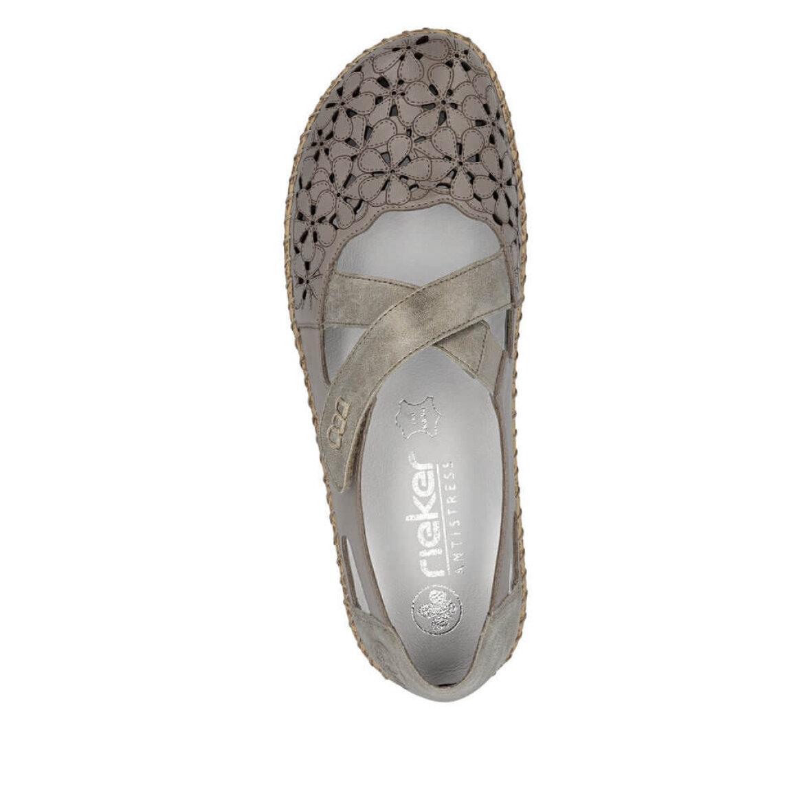 Skoen er med kryds remme over forfoden, hvor den ene justeres med velcrorem. Indeni er en blød skind indlægssål med Riekers AntiStress teknologi, som blandt andet indebære fleksibilitet, lethed, rummelighed samt stødabsorbering.