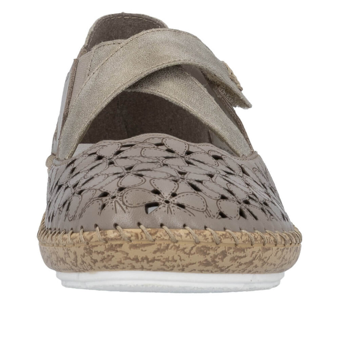 Skoen er med flotte stikninger langs ydersålen i kork look. Skoen har en hælhøjde på 2,5 cm og en bund med struktur, som giver stabilitet når man går med skoen.