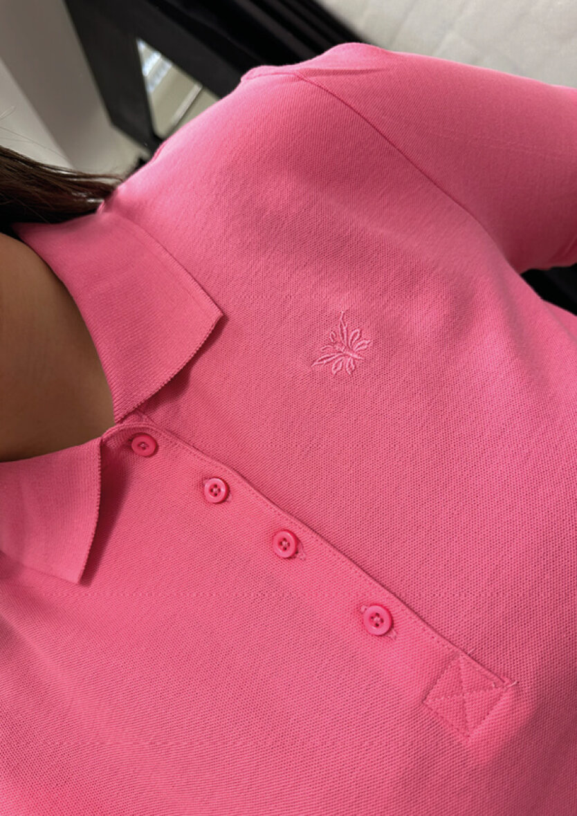 Den klassiske krave med knapper og stolpeluk, giver et tidløst præg, mens den let figursyede pasform skaber en smuk og flatterende silhuet. Poloen er med korte ærmer og en broderet detalje på brystet i matchende farve.