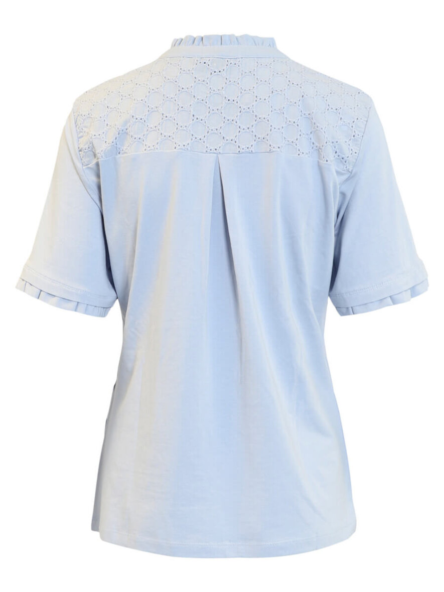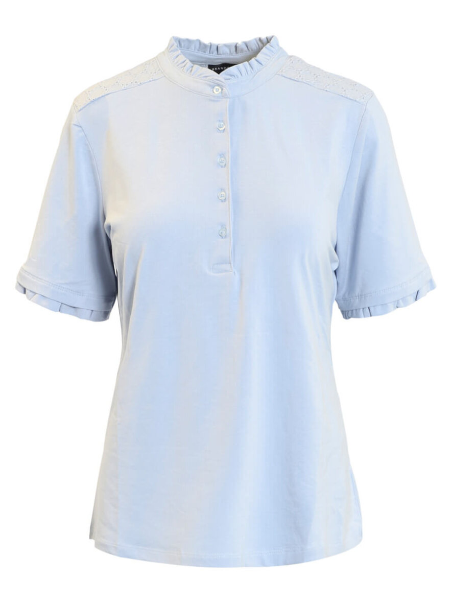 Brandtex bluse i en flot lyseblå farve med fine og feminine detaljer. Blusen er med rund hals med flæsekant langs halsåbningen. Skulderne og bagpå er med et sødt broderet hulmønster, som tilføjer et feminint touch til designet.