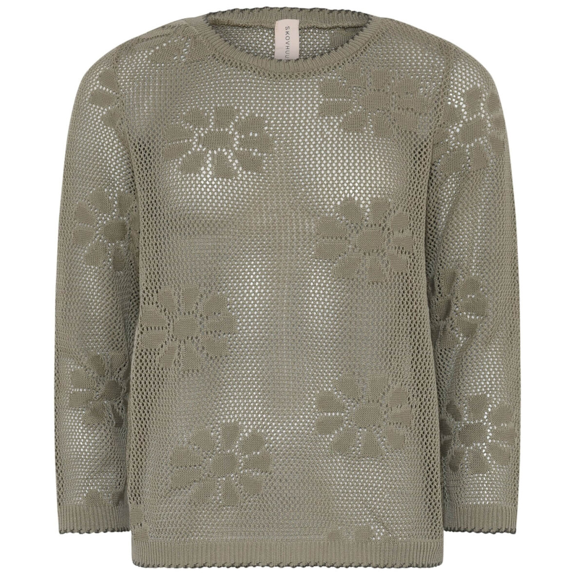 Skovhuus strik i et skønt hulmønster med blomster vævet i designet. En sød og feminin forår- og sommerstriktrøje i en flot oliven grøn farve.