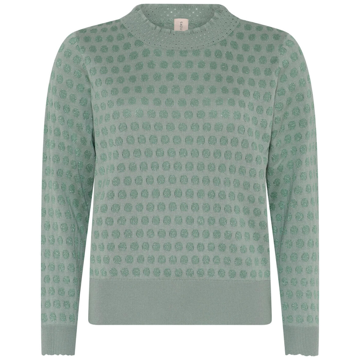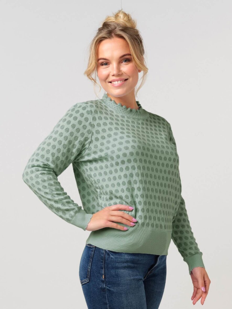 Skovhuus strik i en flot oliven grøn farve med et prikket mønster med glimmer detaljer, som giver designet et feminint touch.