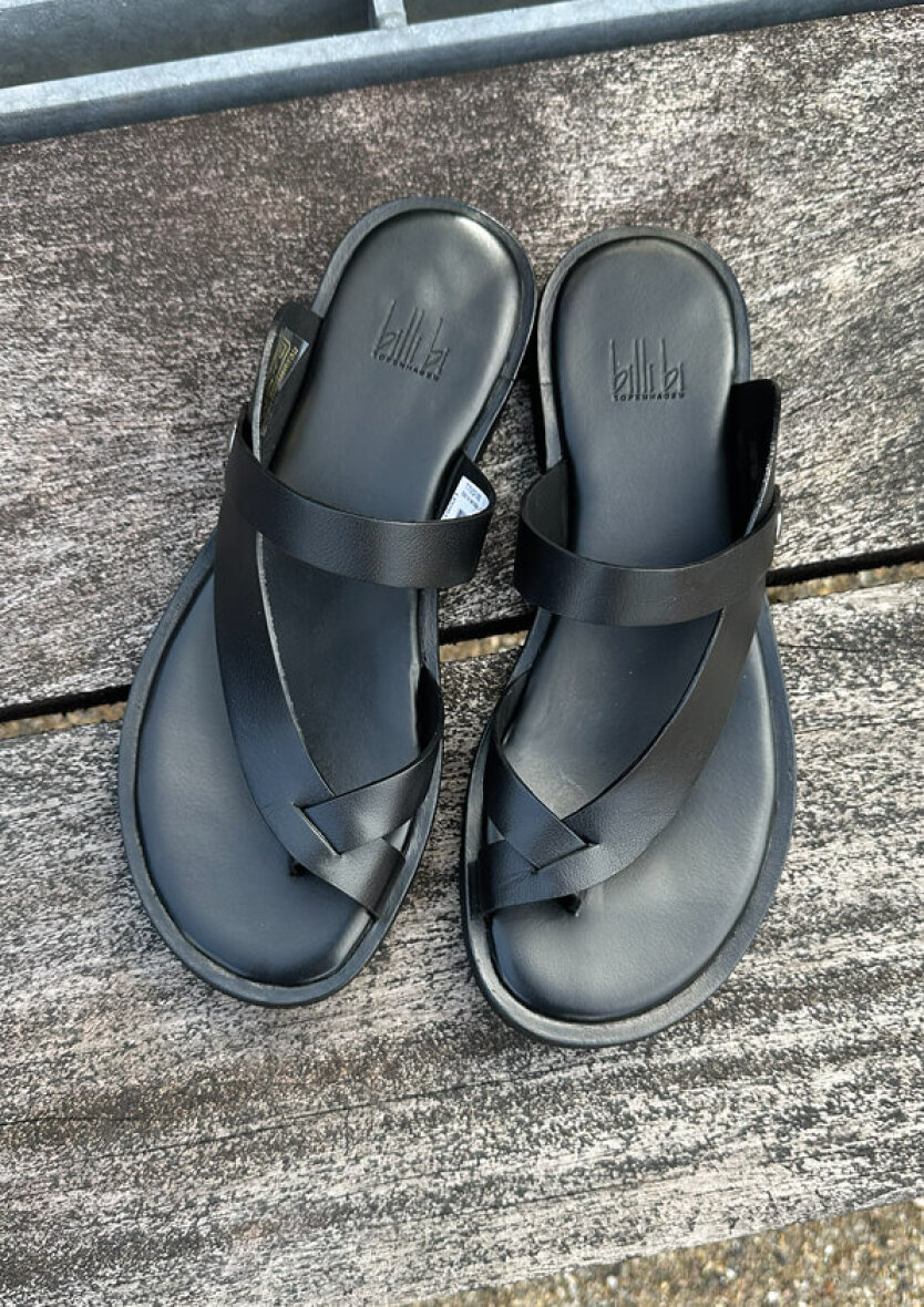 Flot og elegant slip-in sandal fra Billi Bi. Den håndlavede sandal er udført i sort glat skind på overdelen, indlægssålen og ydersålen for et elegant design.
