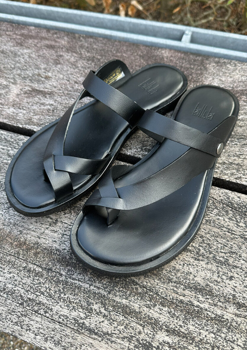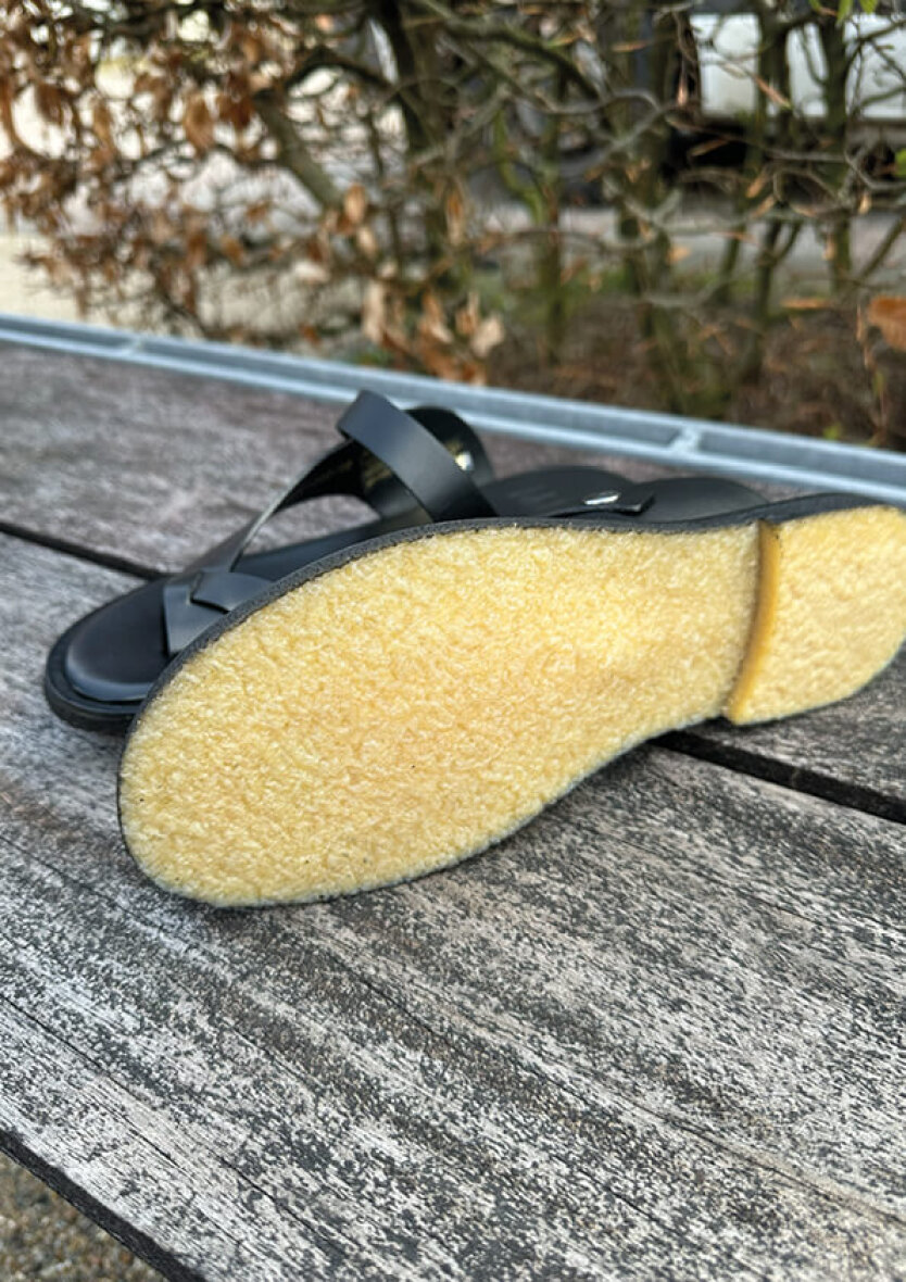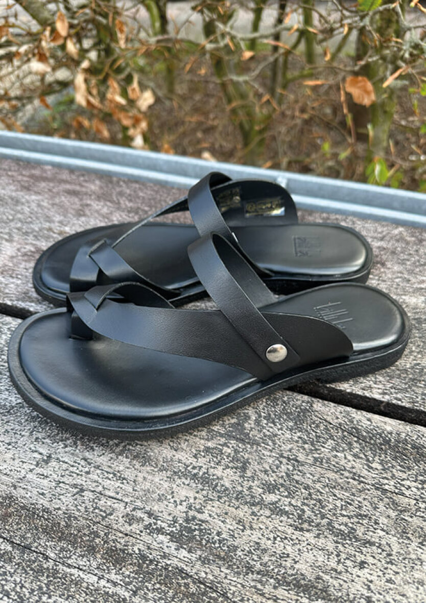 Den sorte sandal er lavet med tårem og stropper der krydser henover hinanden over vristen. Indersålen er en dejlig blød skind sål, som bliver blødere ved brug. Derudover er sandalen lavet med en rågummisål for optimal komfort.