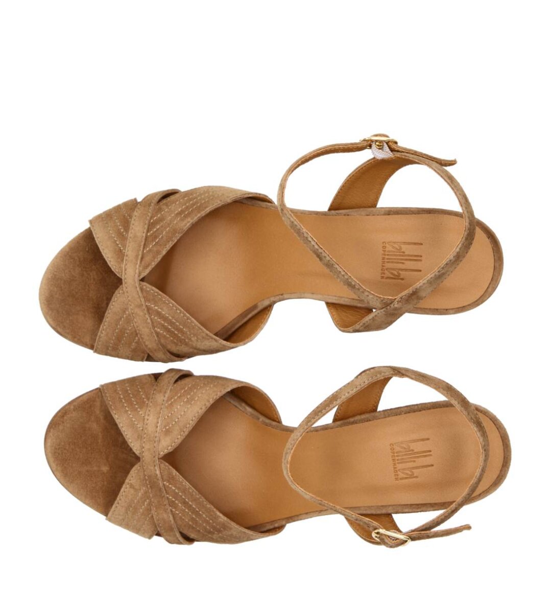 Billi bi sandal med hæl i lysebrunt ruskindskvalitet. De håndlavet sandaler er med en fodformet overdel med dekorative syninger og de buede kanter giver et feminint touch til designet.