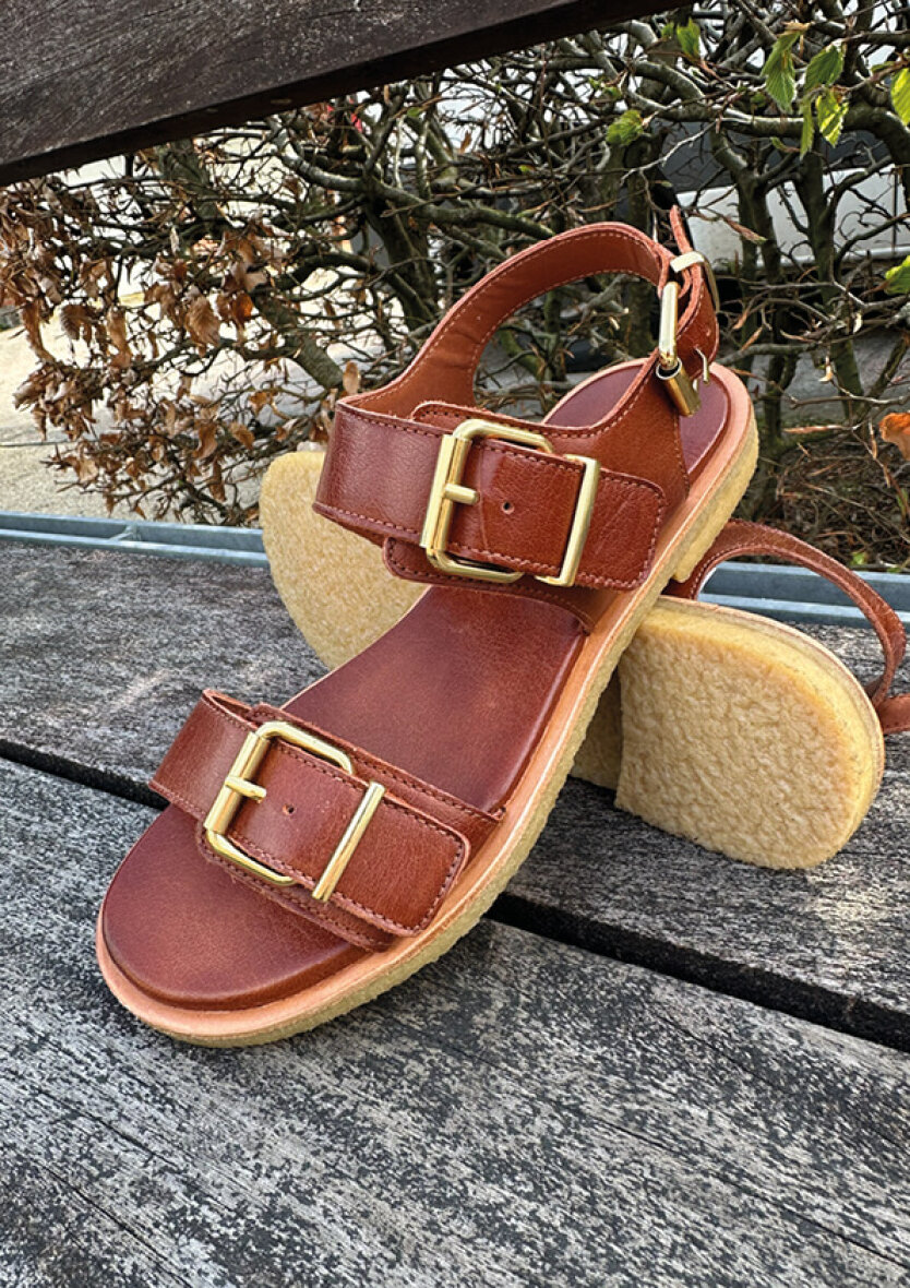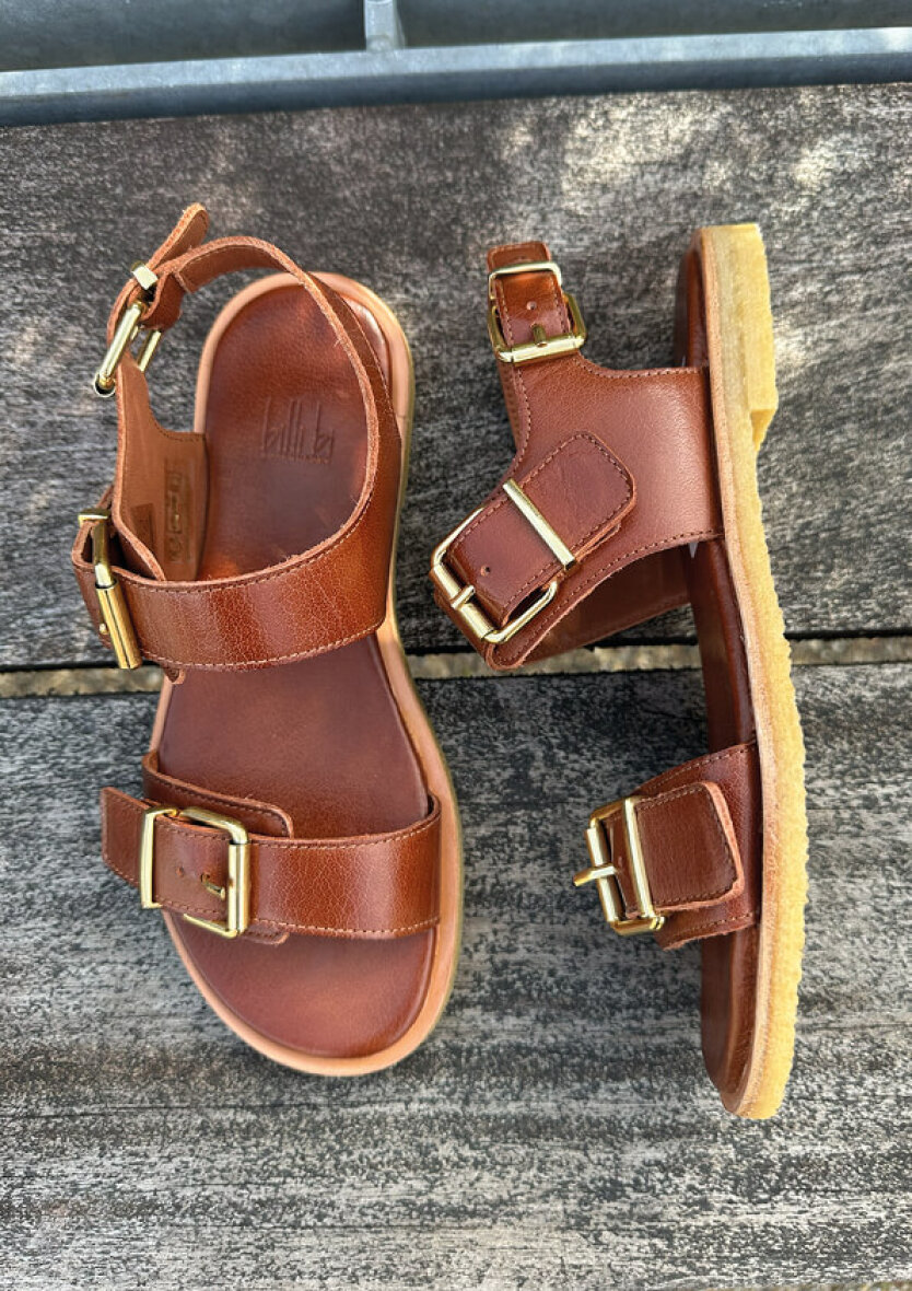 Flot og elegant sandal fra Billi Bi i en moderne brun farve. Den håndlavede sandal er udført i brun glat skind på overdelen med tre regulerbare spænderemme i guldlook, så sandalen er nem at tilpasse foden.