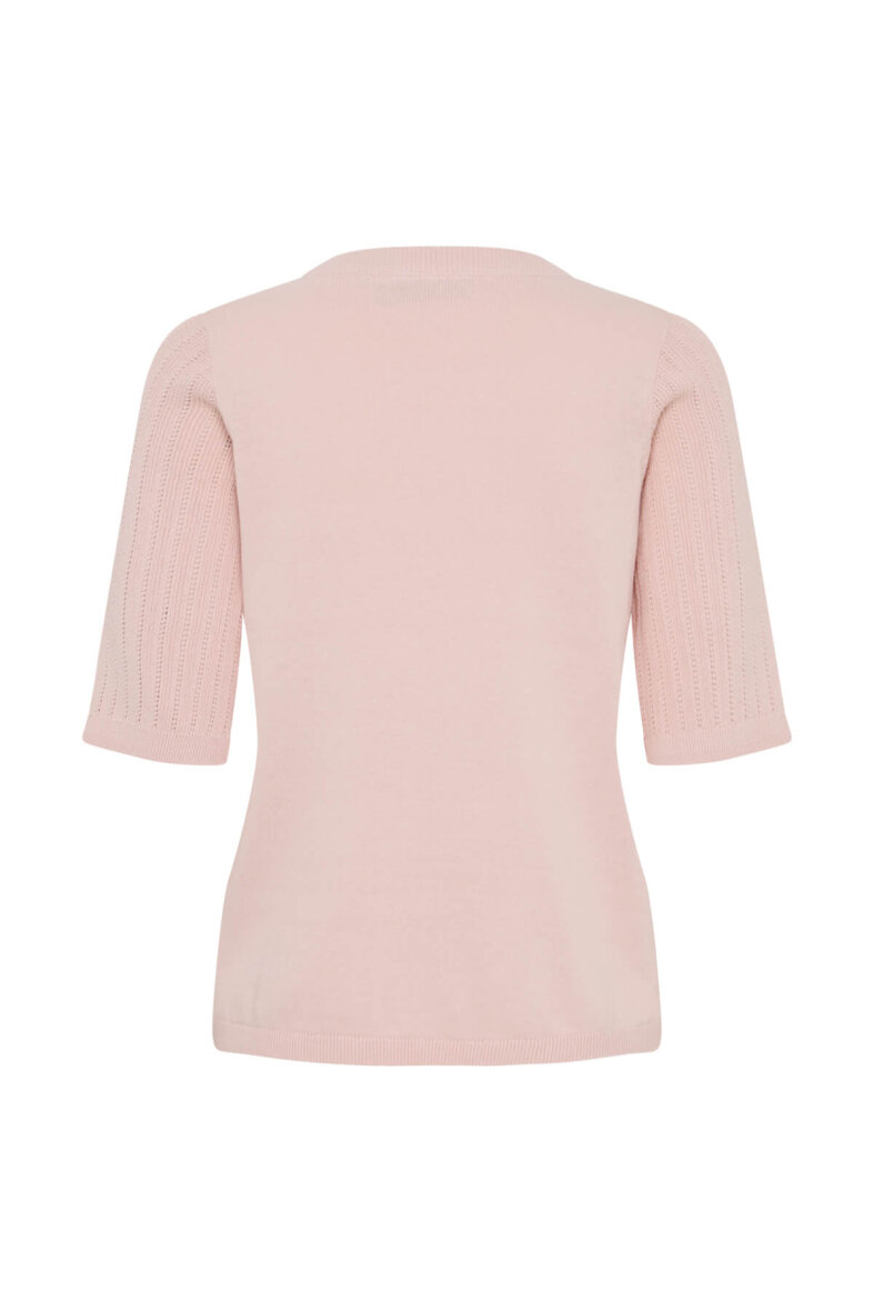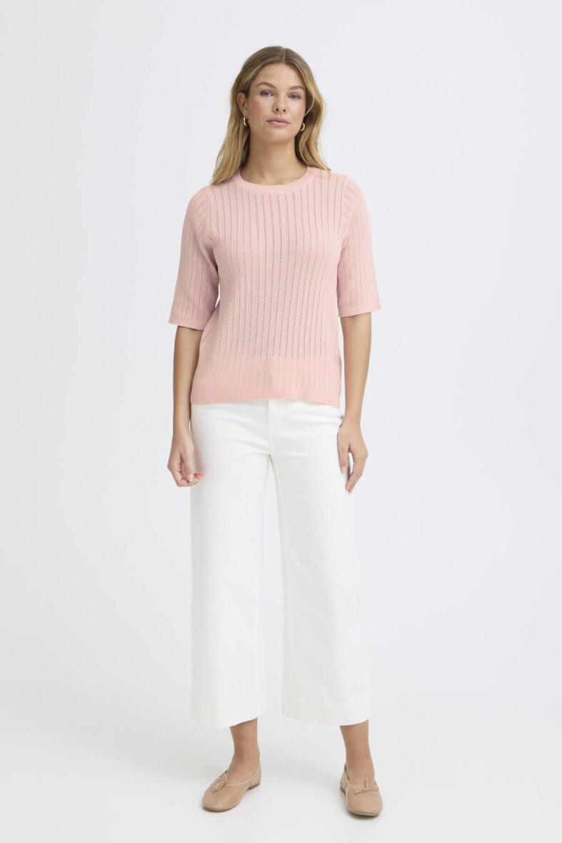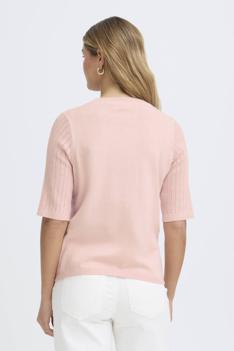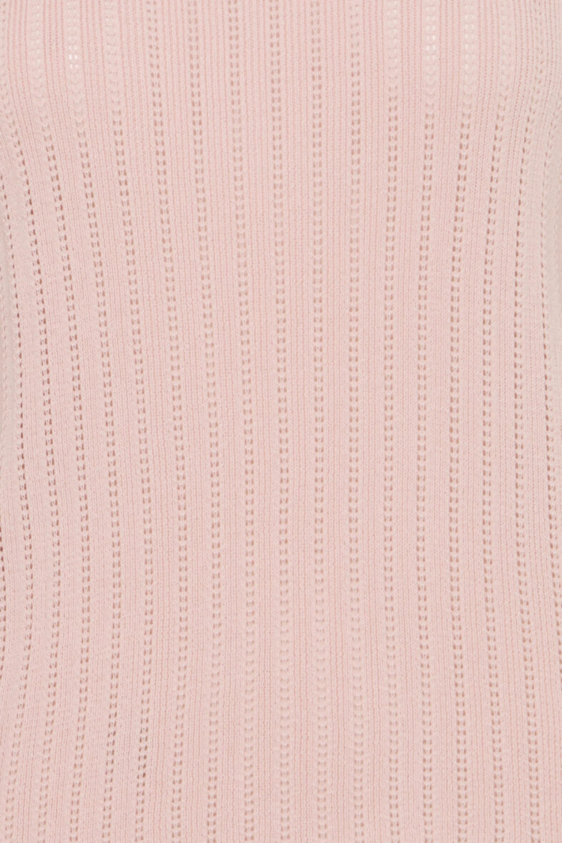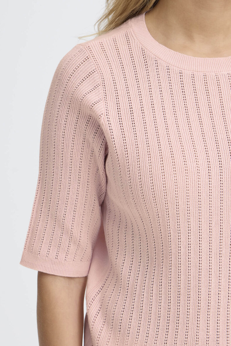 Fransa strik med korte ærmer i en flot rosa farve. Modellen Cammy er med et fint og enkelt vævet hulmønster i lodrette striber på fronten og ærmerne.