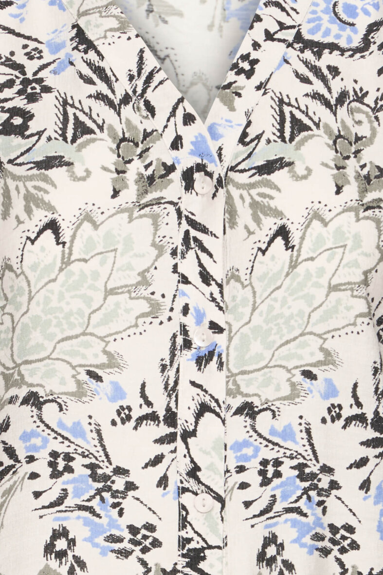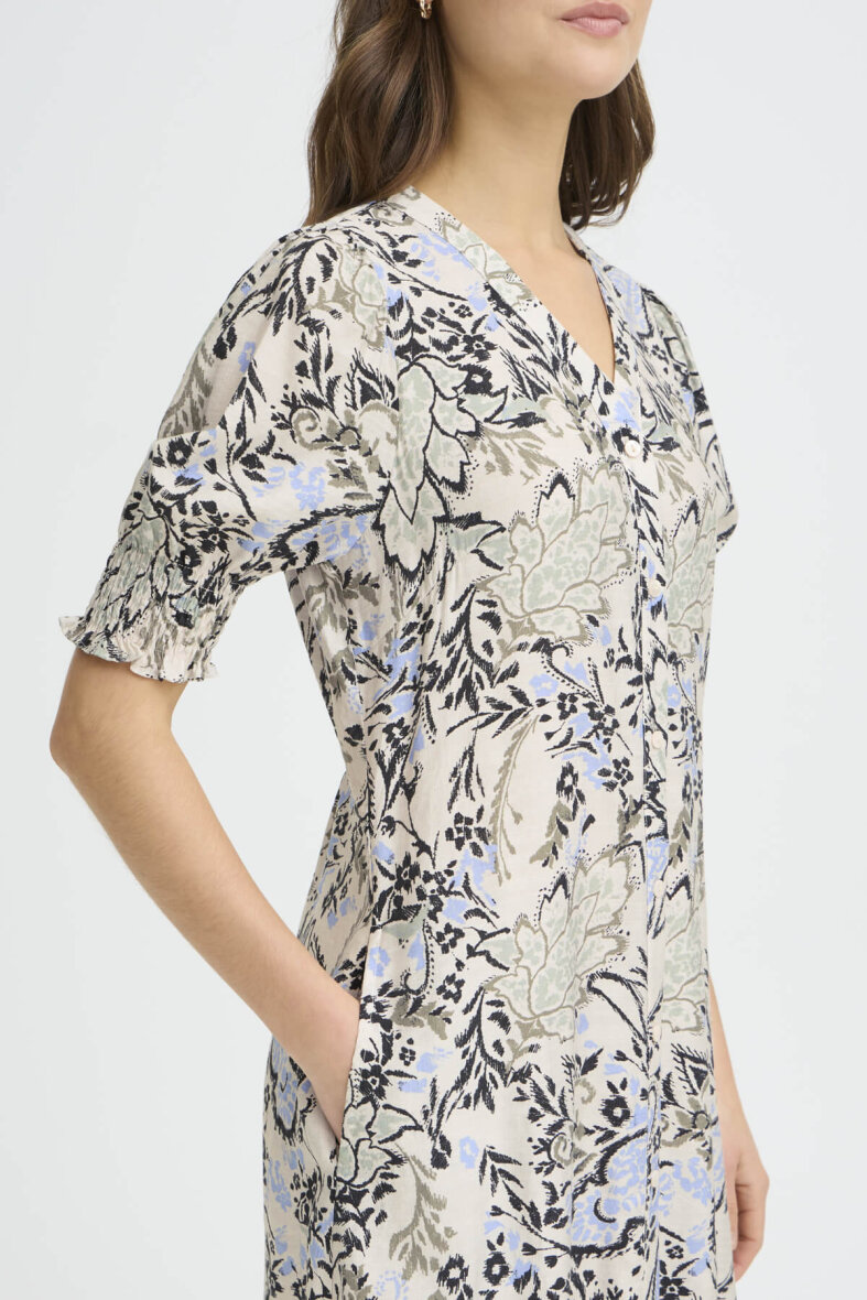 Kjolen er med v-halsudskæring og lukkes med gennemgående knapper på fronten. Kjolen er med korte ærmer med smock og flæsekant med let puf effekt ved skuldrene. Bagpå er kjolen med et smock stykke, som skaber en flatterende pasform.