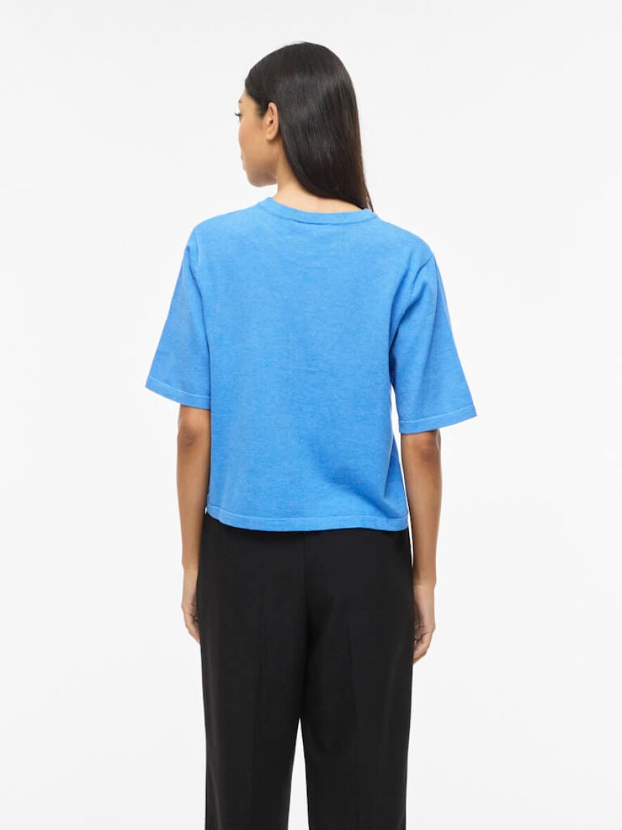 VILA strik i en flot blå meleret farve. Den kortærmet strik er lavet i et enkelt design med rund hals og ribkant ved alle åbninger. Vimalu strikken er lavet i en cropped pasform med god rummelighed.