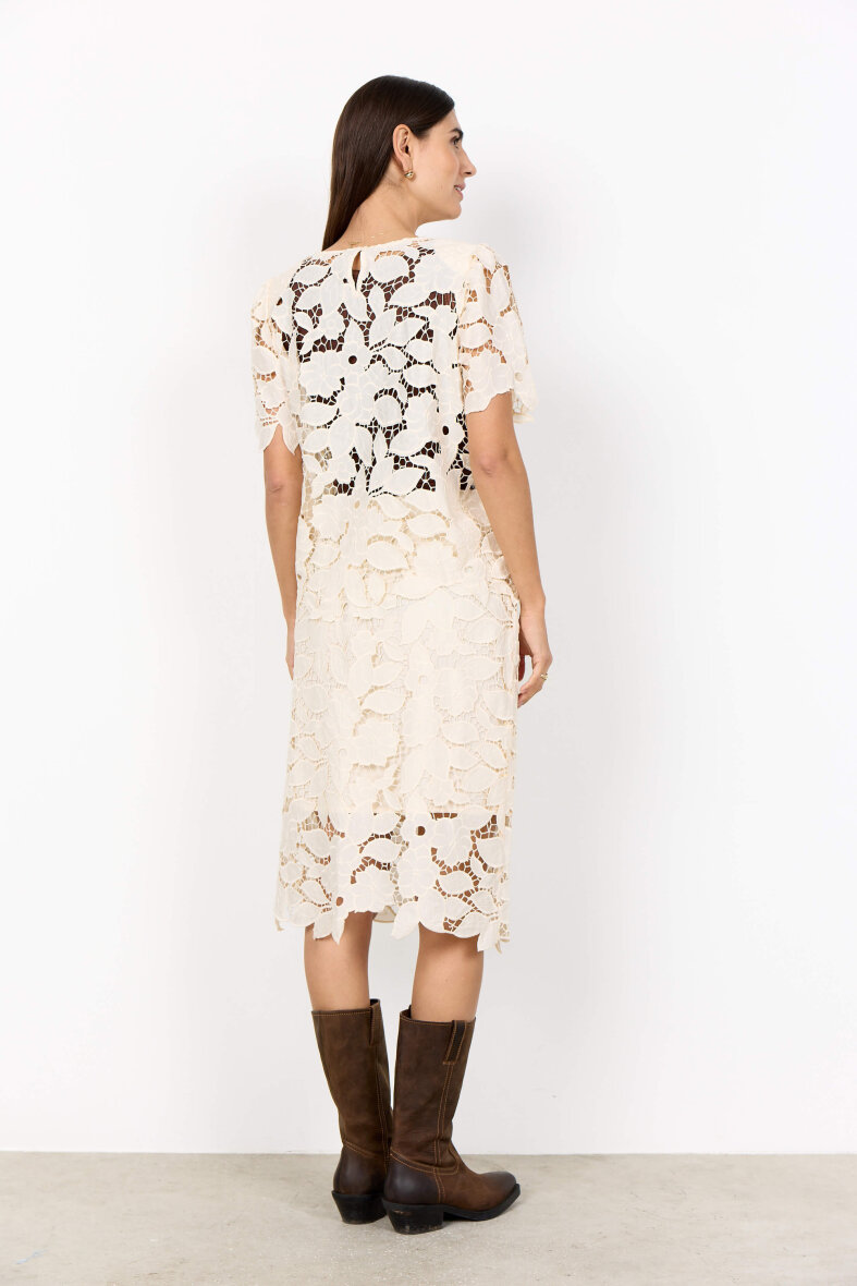 Soyaconcept bluse i et delikat blomstret blondedesign i en flot creme farve. Blusen er med rund hals med knapluk i nakken og korte ærmer med skjulte skulderpuder.