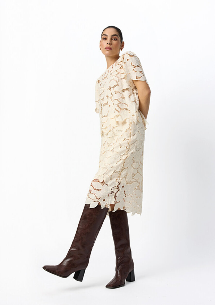 Det smukke hulmønster og gennemsigtighed gør sig godt med en top under for diskretion. Style evt. med en lys top for at bevare det lyse look eller en brun eller sort top for at fremhæve det smukke blonde/broderingsmønster.