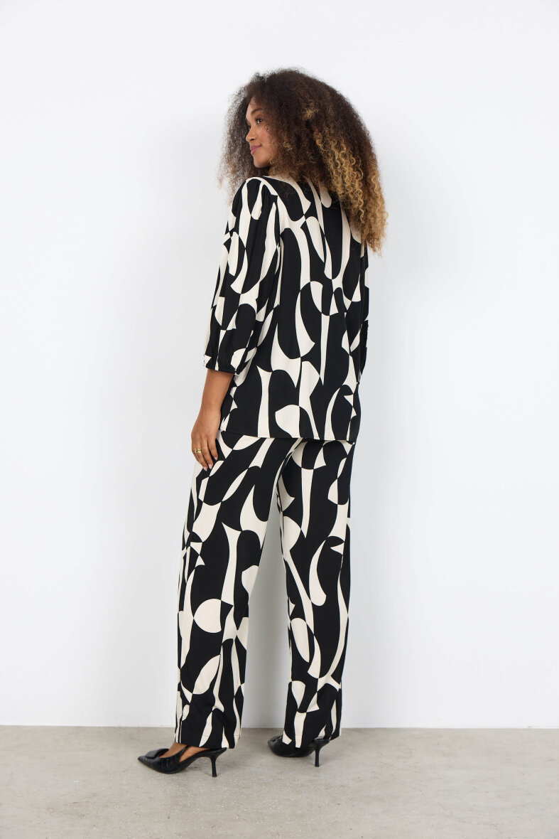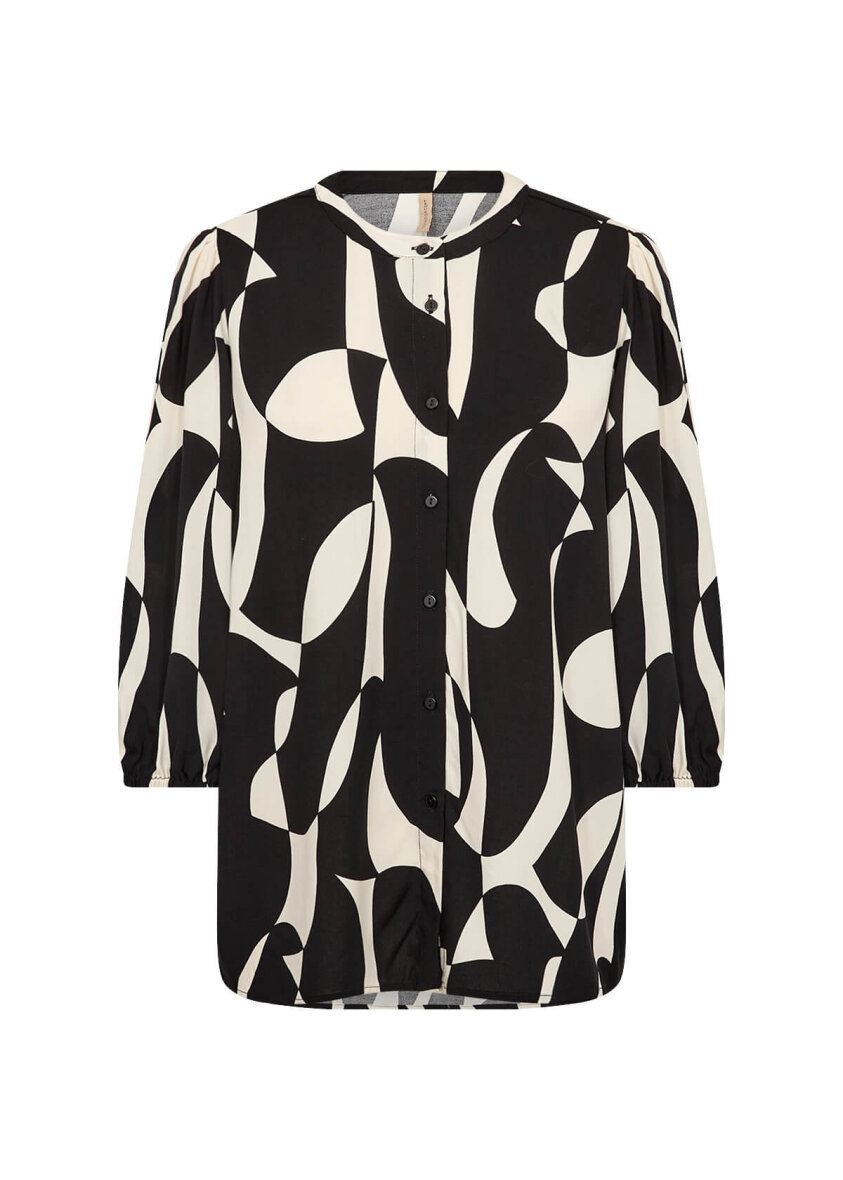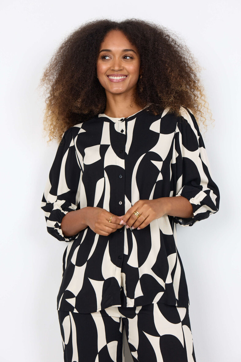 Soyaconcept skjorte i et flot abstrakt print i sort og off white farver. Skjorten er med rund hals med sorte gennemgående knapper langs fronten. Skjorten er med let puf ved skuldrene og 3/4 lange ærmer som afsluttes med elastikkant.