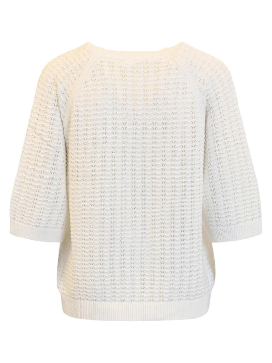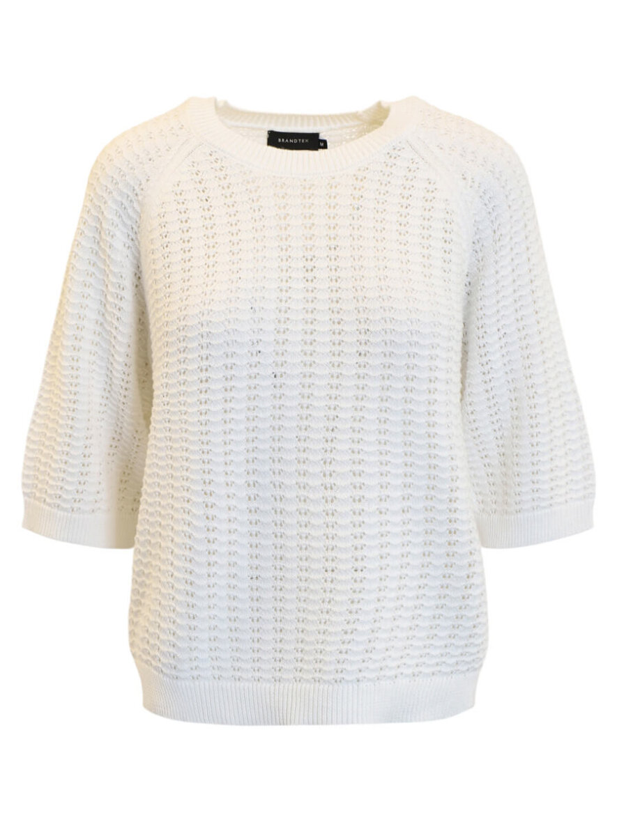 Brandtex strikket bluse i en alsidig off white farve i et flot vævet hulmønster, som er nem at style med diverse farver og prints. En sød strik som denne gør sig godt i basisgarderoben og kan bruges til både jeans, nederdele og over kjoler.