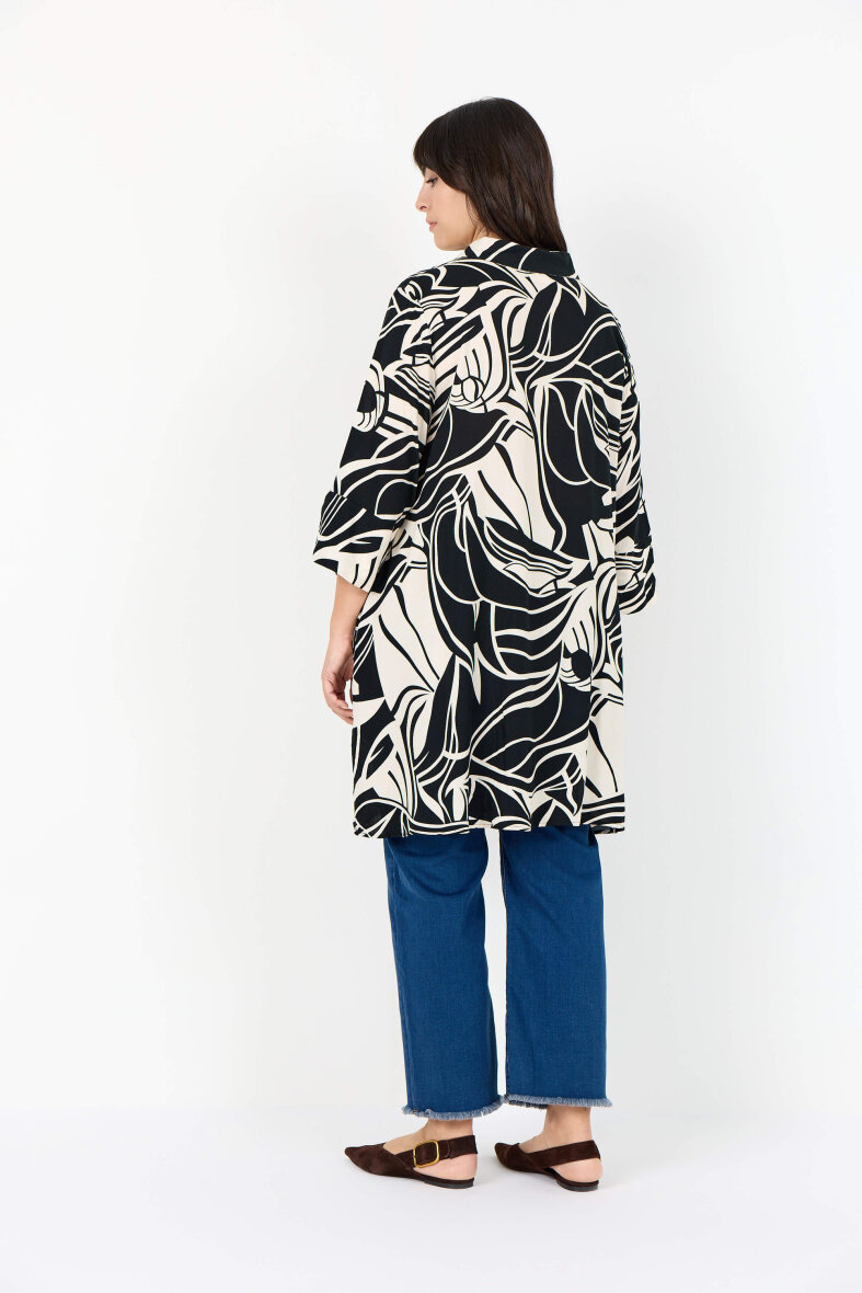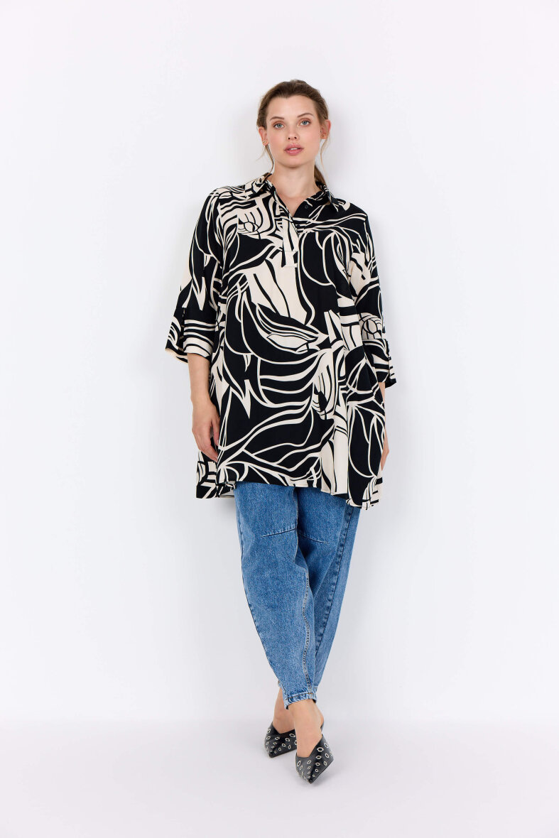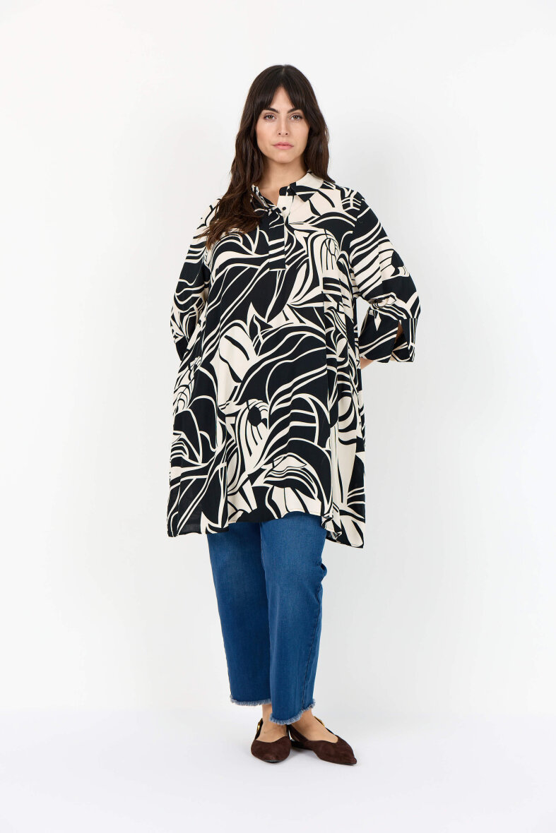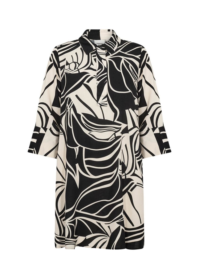Wasabiconcept tunika/kjole i et flot grafisk print i sort og off white. Tunikaen er med krave, stolpeluk og skjulte knapper foran.