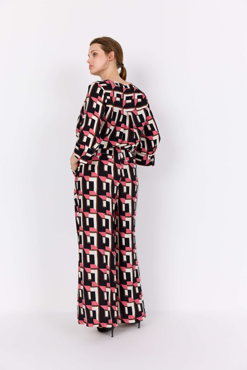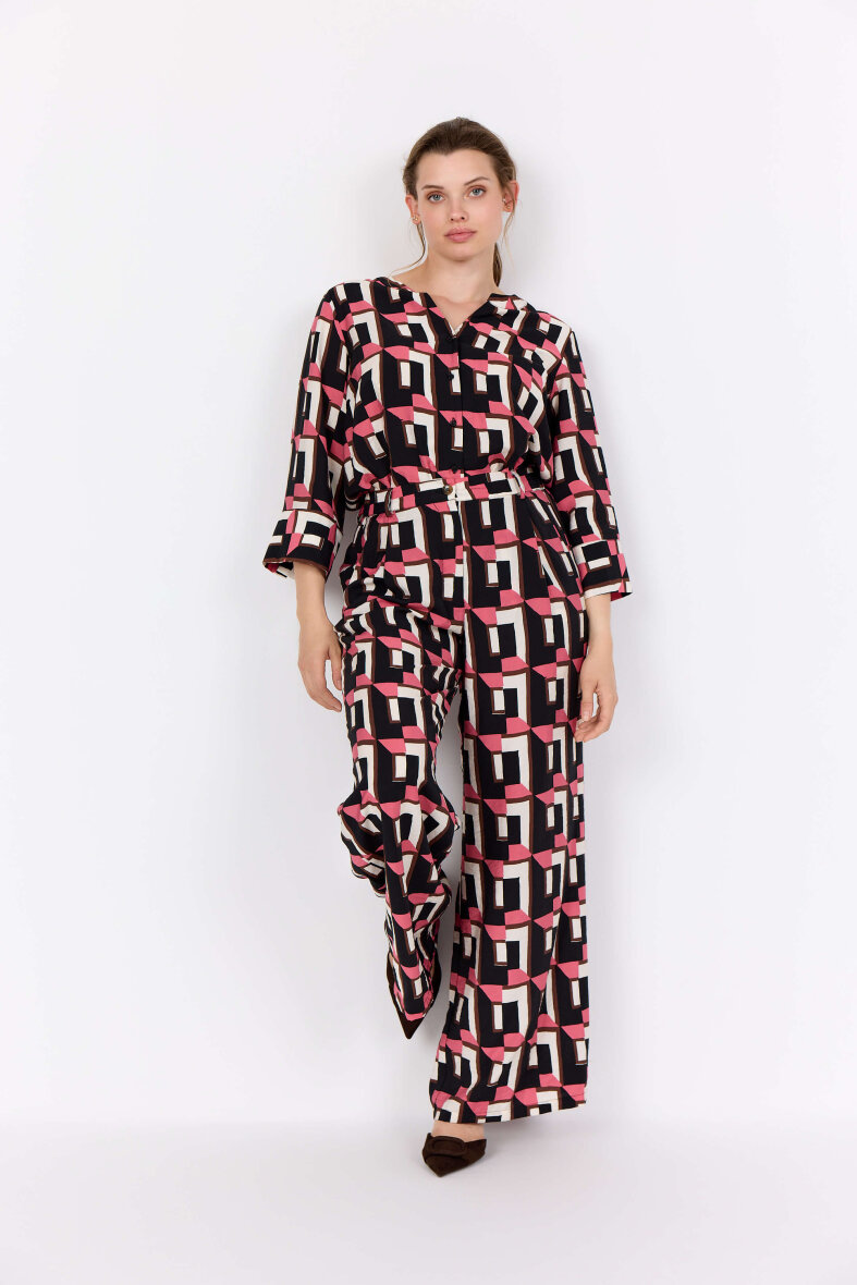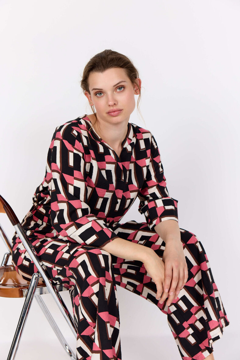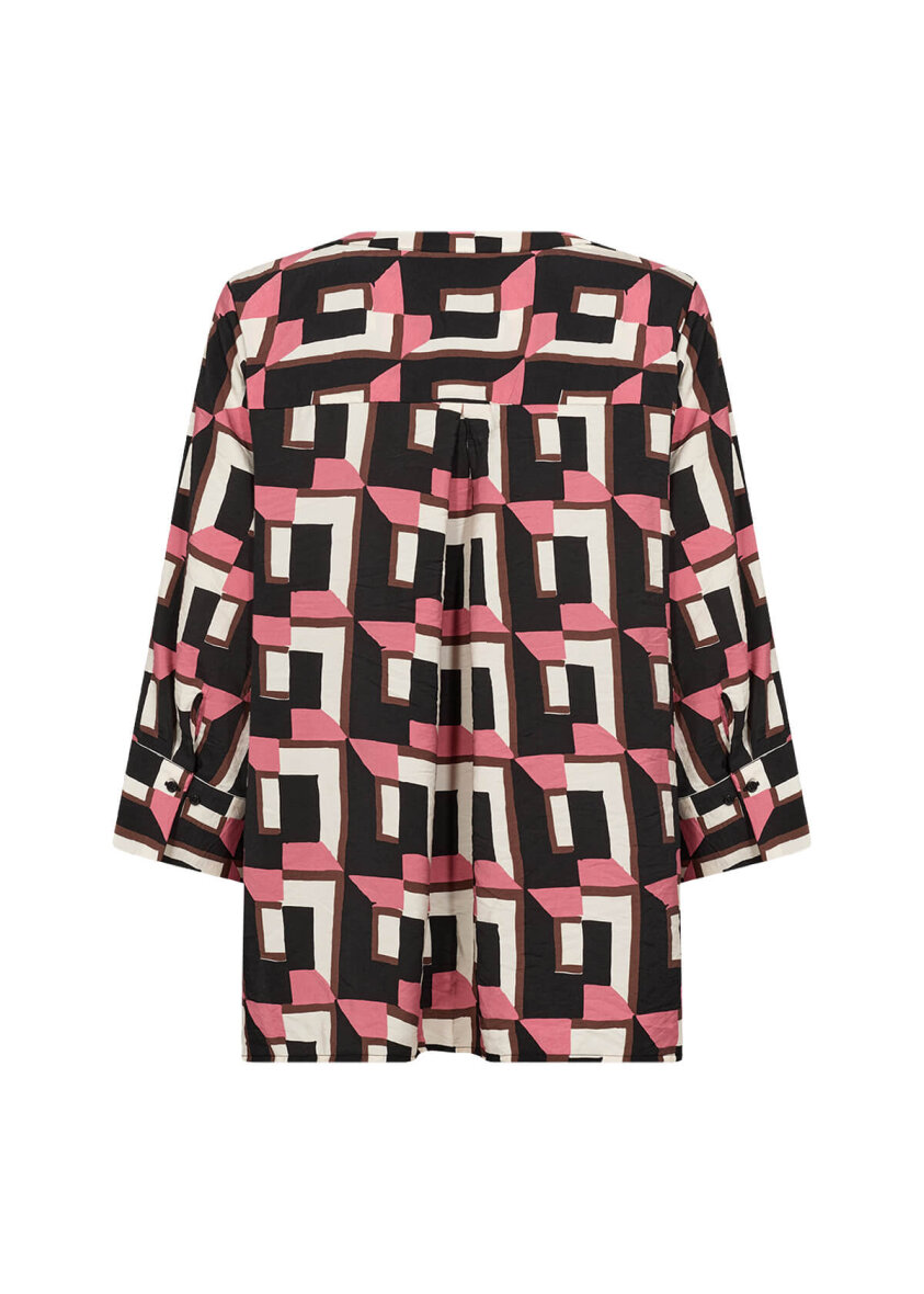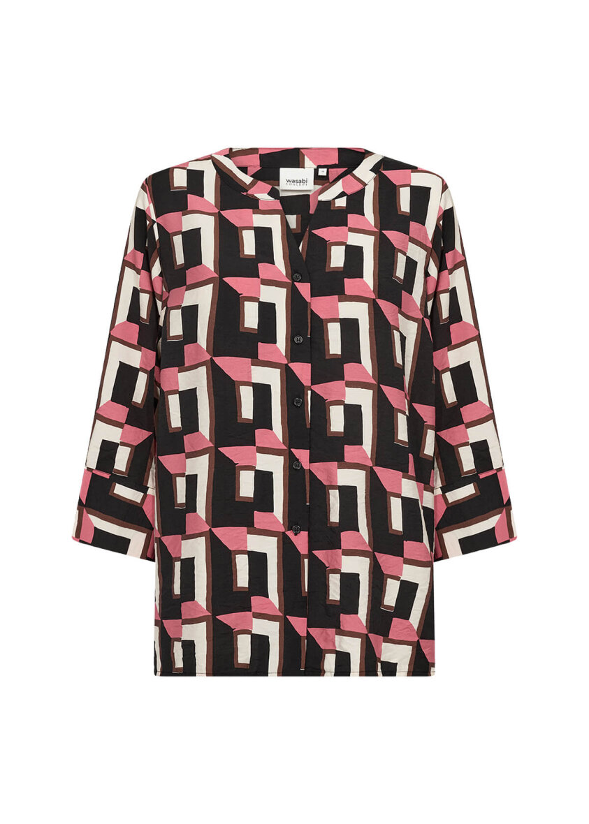 Flot og farverig Wasabiconcept skjorte i modellen Sarena. Skjorten er lavet i et grafisk print i pink, sort, sand og brun farvekombination.