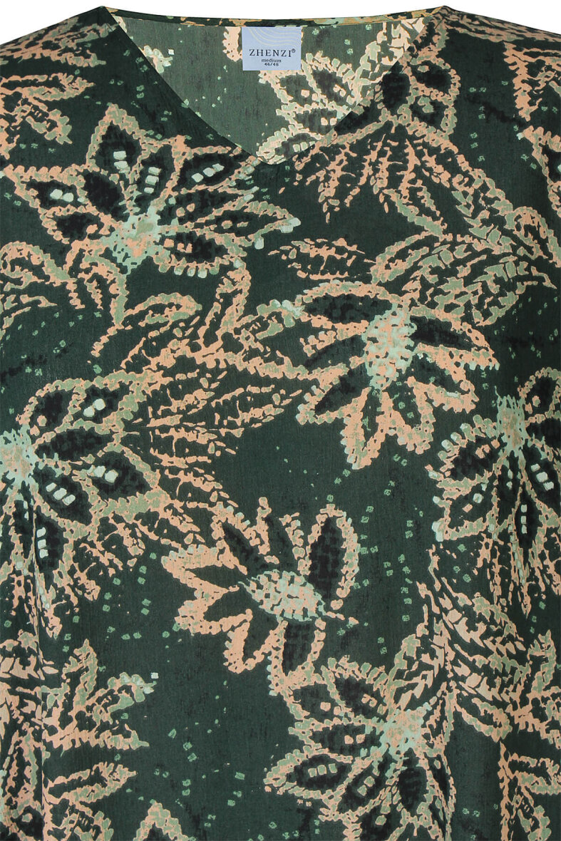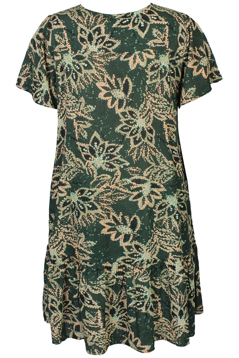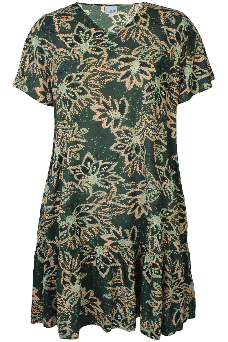 Zhenzi kjole i modellen ELYSA er lavet i en moderne mørkegrøn farve med et all-over mønster i beige, rosa og grønne nuancer.