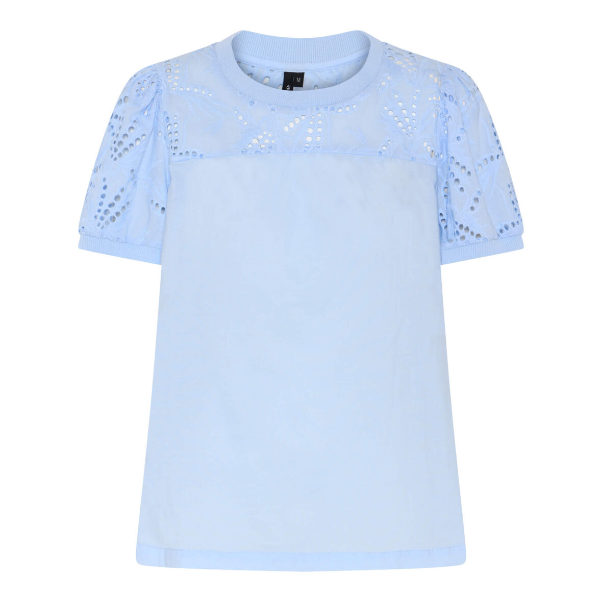 Soulmate bluse i en flot lyseblå farve i modellen LOTTI. Blusen er med et hulmønster med broderingsdetaljer på blusens øverste del på både front og bag.