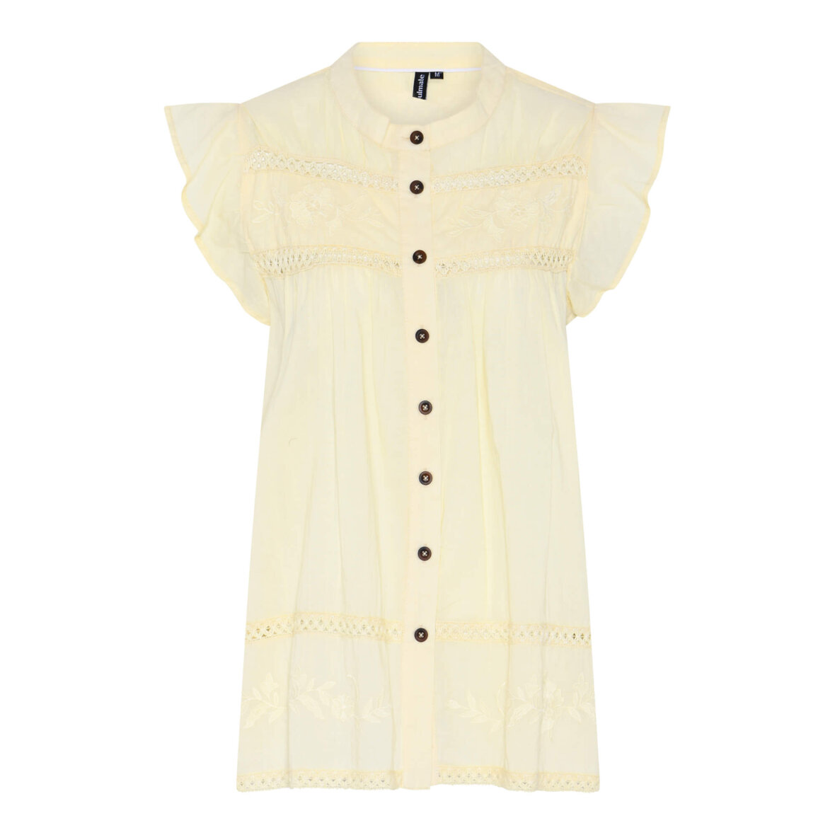 Skjorten er med rund hals, ærmeløs med flæsekant og gennemgående knapper langs fronten.