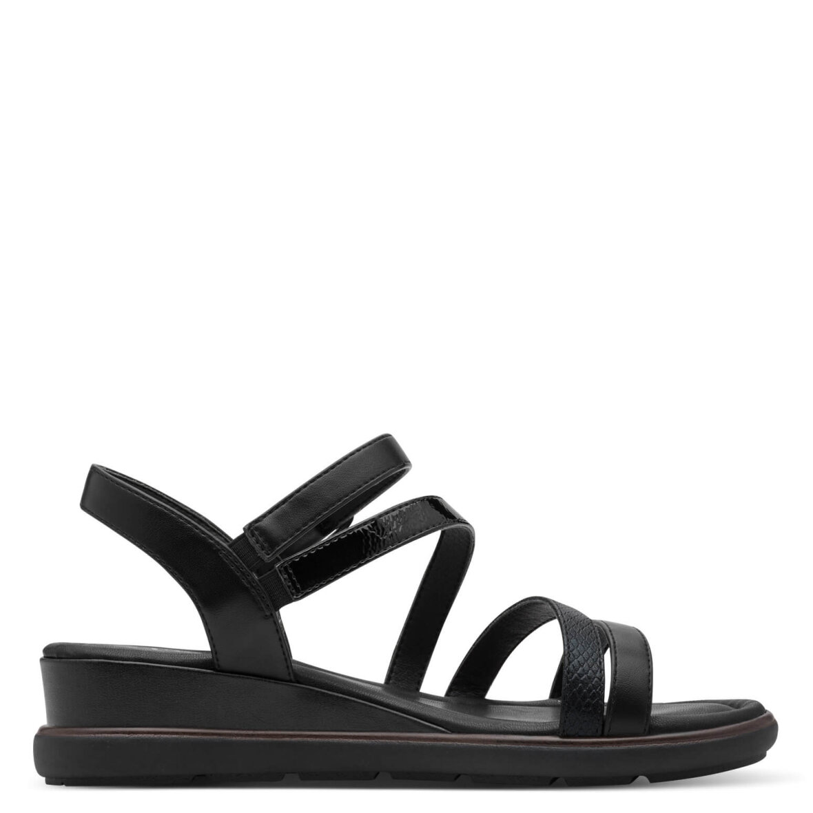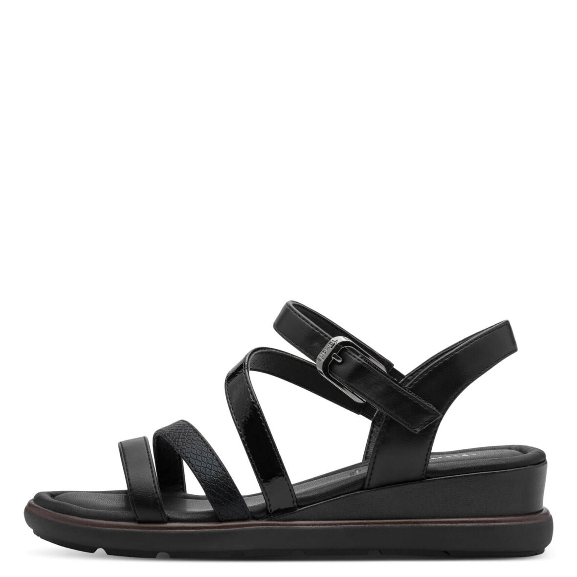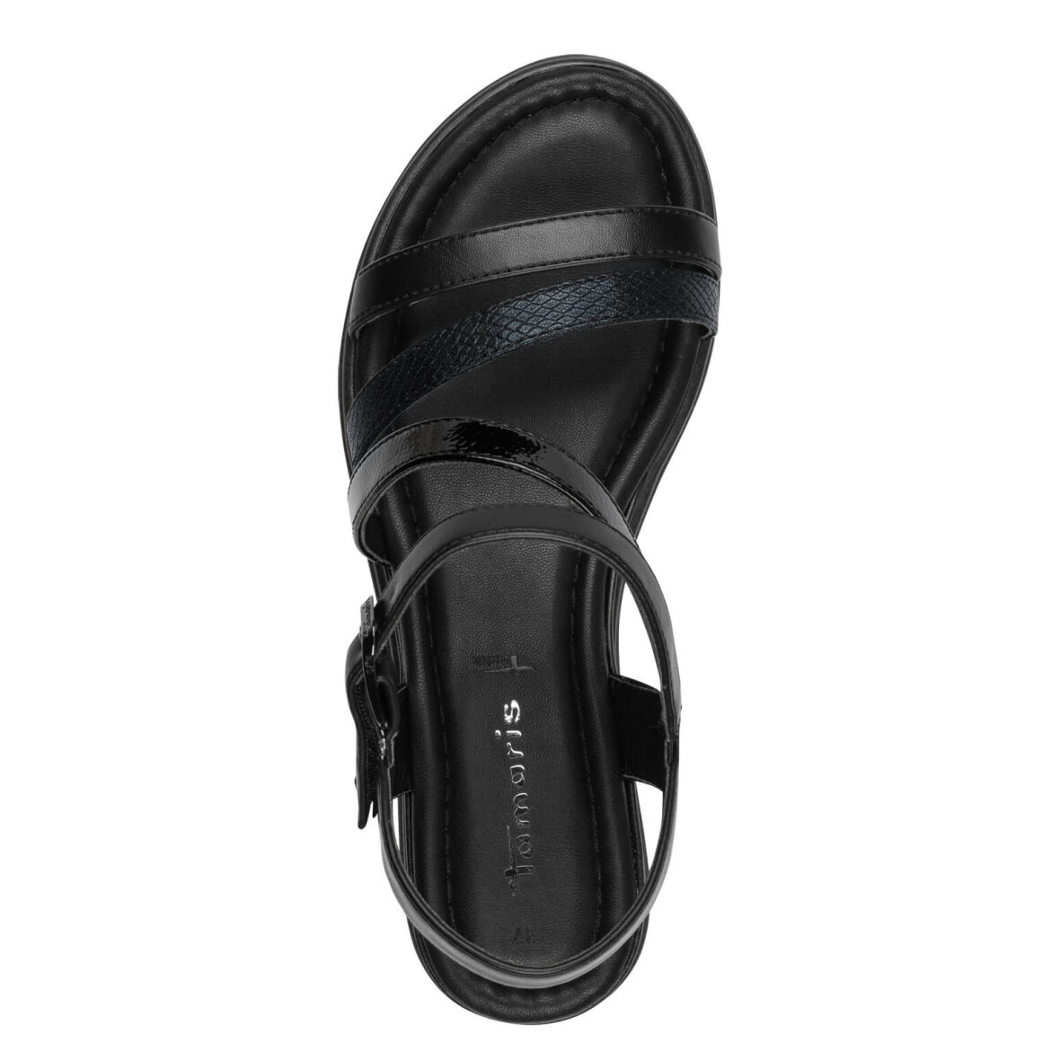 Tamaris sandaler i et elegant design. Wedgesandalen er udført i sort imiteret skind med med smalle remme over forfoden og en justerbare spænderem. Indeni er Tamaris' bløde touch-it indersål, som sikrer en god komfort hele dagen lang.