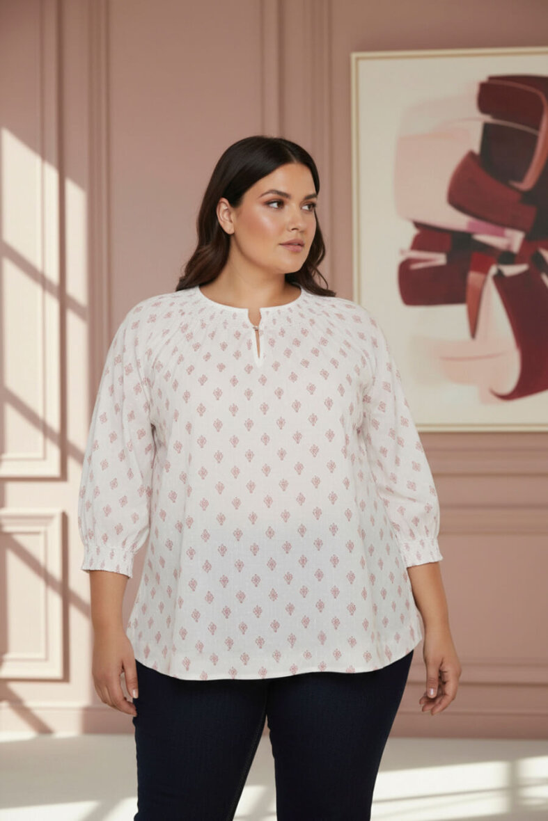 Blusen er med rund hals medet lille v-stykke og knap detalje. Blusen er med smock detalje om hals åbningen og afslutningsvis på 3/4 ærmet.