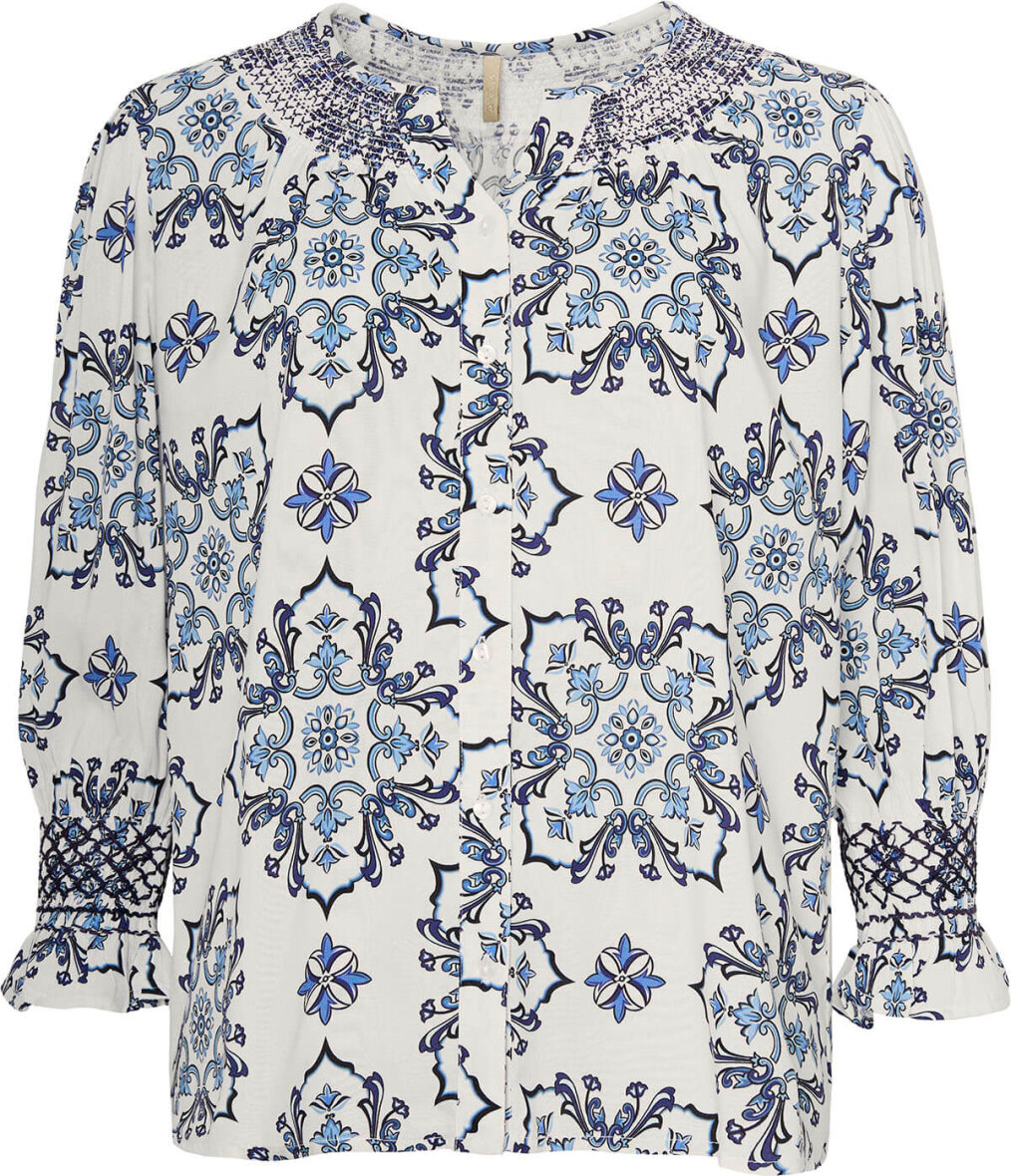 Cassiopeia bluse/skjorte i modellen Fiella i et flot og feminint design. Skjorten er lavet i en off white farve det fineste mønster i blå nuancer.