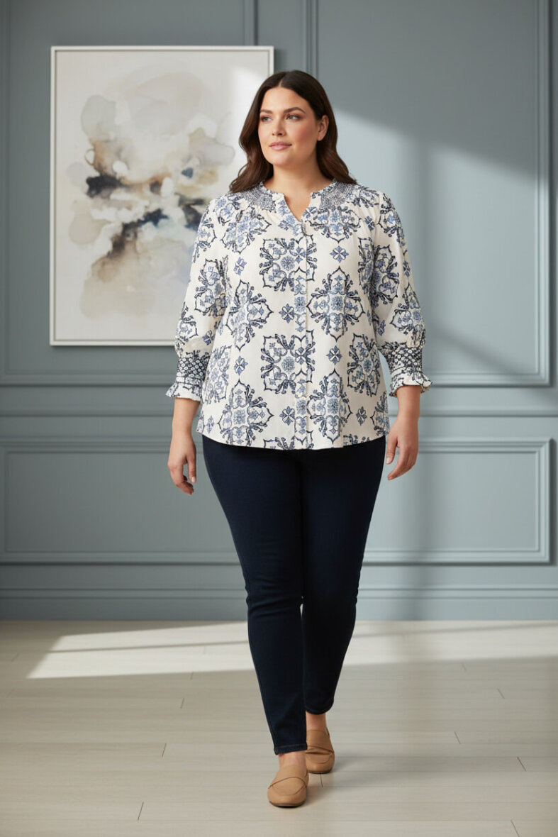 Skjorten er med rund hals med v-stykke og smock detalje om hals åbningen og afslutningsvis på 3/4 ærmet. Skjorteblusen er med gennemgående knapper langs fronten.